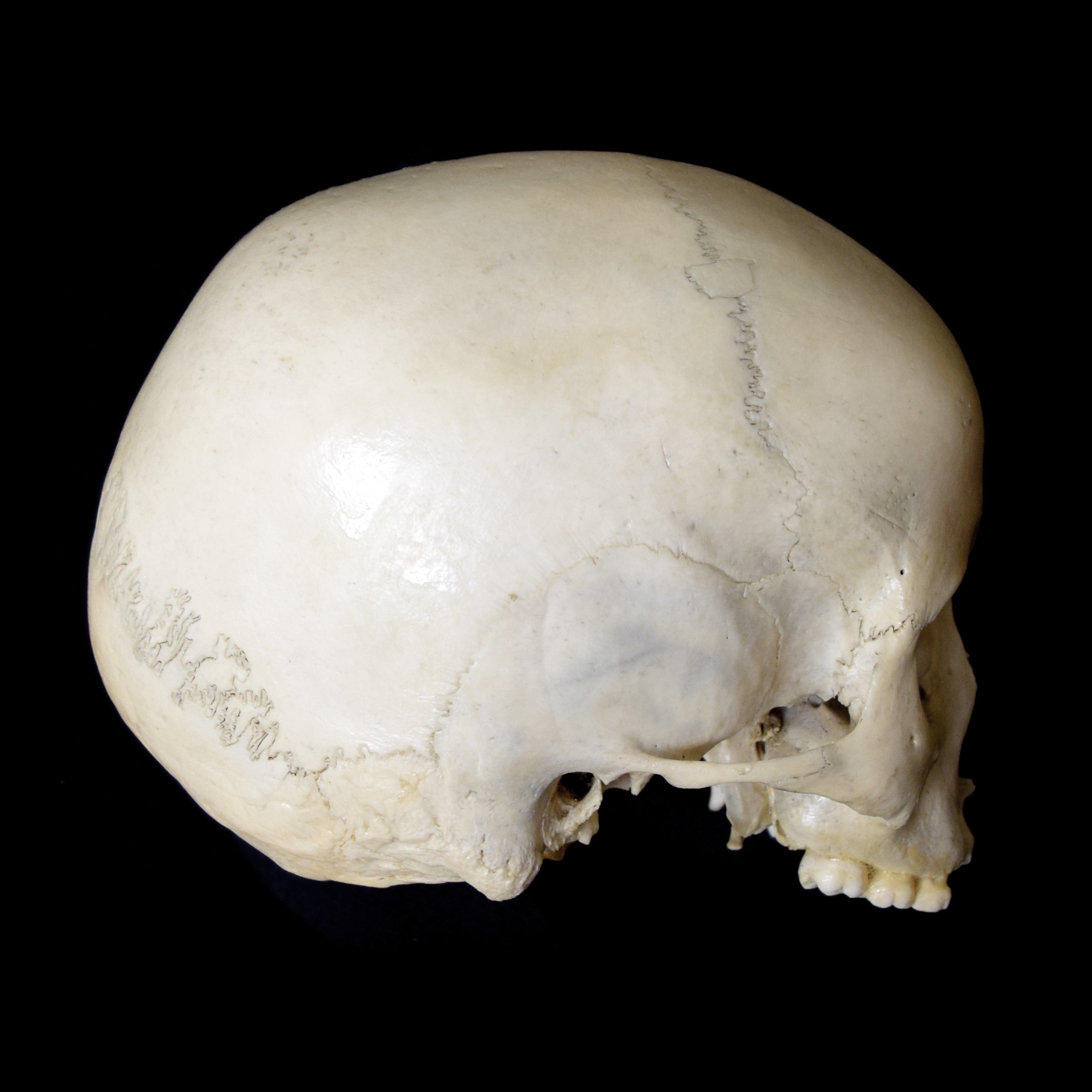 Juvenile human skull. Estimated age 7-9 years. Cranium width 12.7 cm. Right lateral view. |