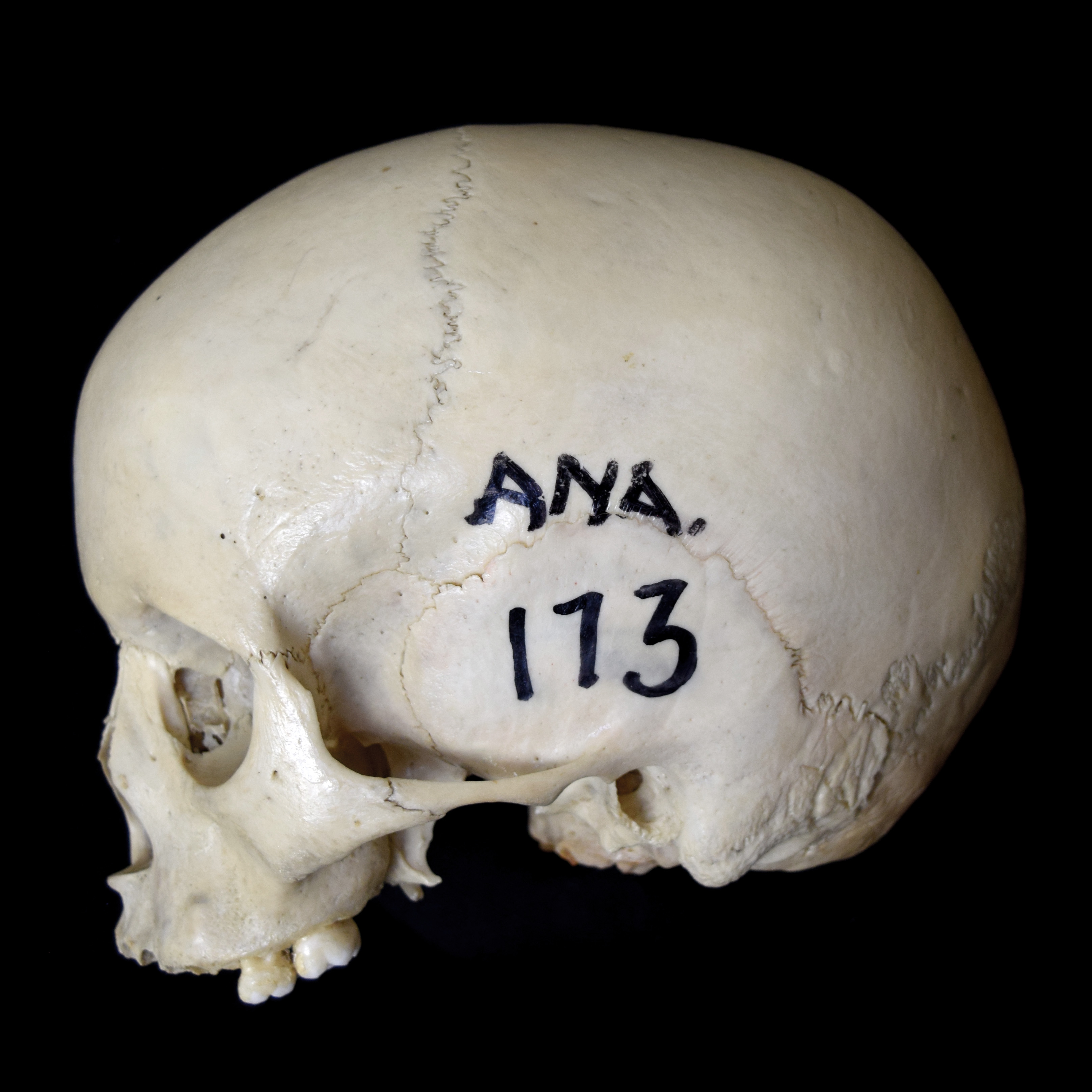 Juvenile human skull. Estimated age 7-9 years. Cranium width 12.7 cm. Left lateral view. |