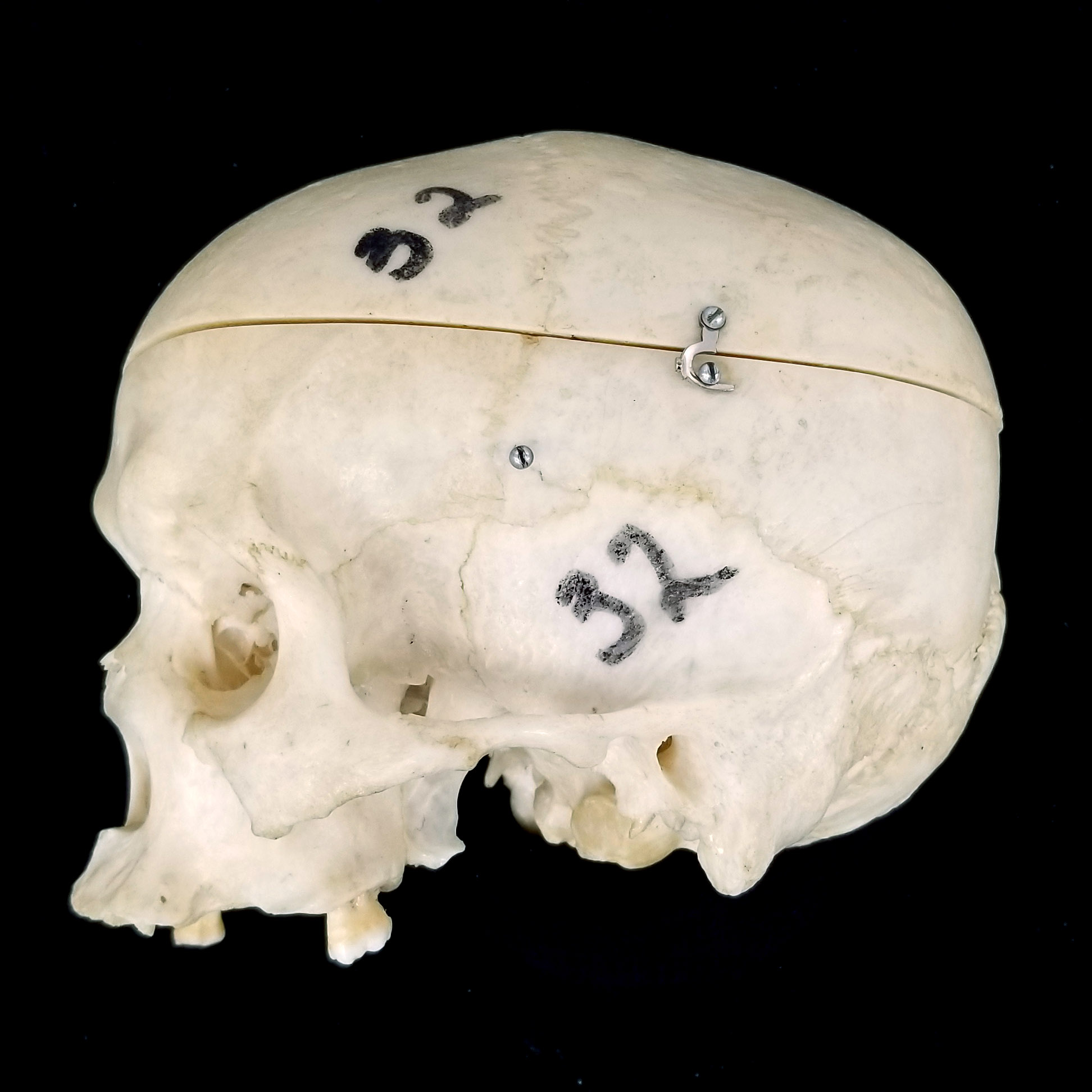 Adult human skull with parietal notch ossicle. Left lateral view. |