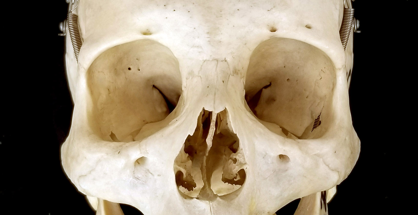 Adult human skull with two supraorbital foramen on left side. Anterior view of orbital region. |