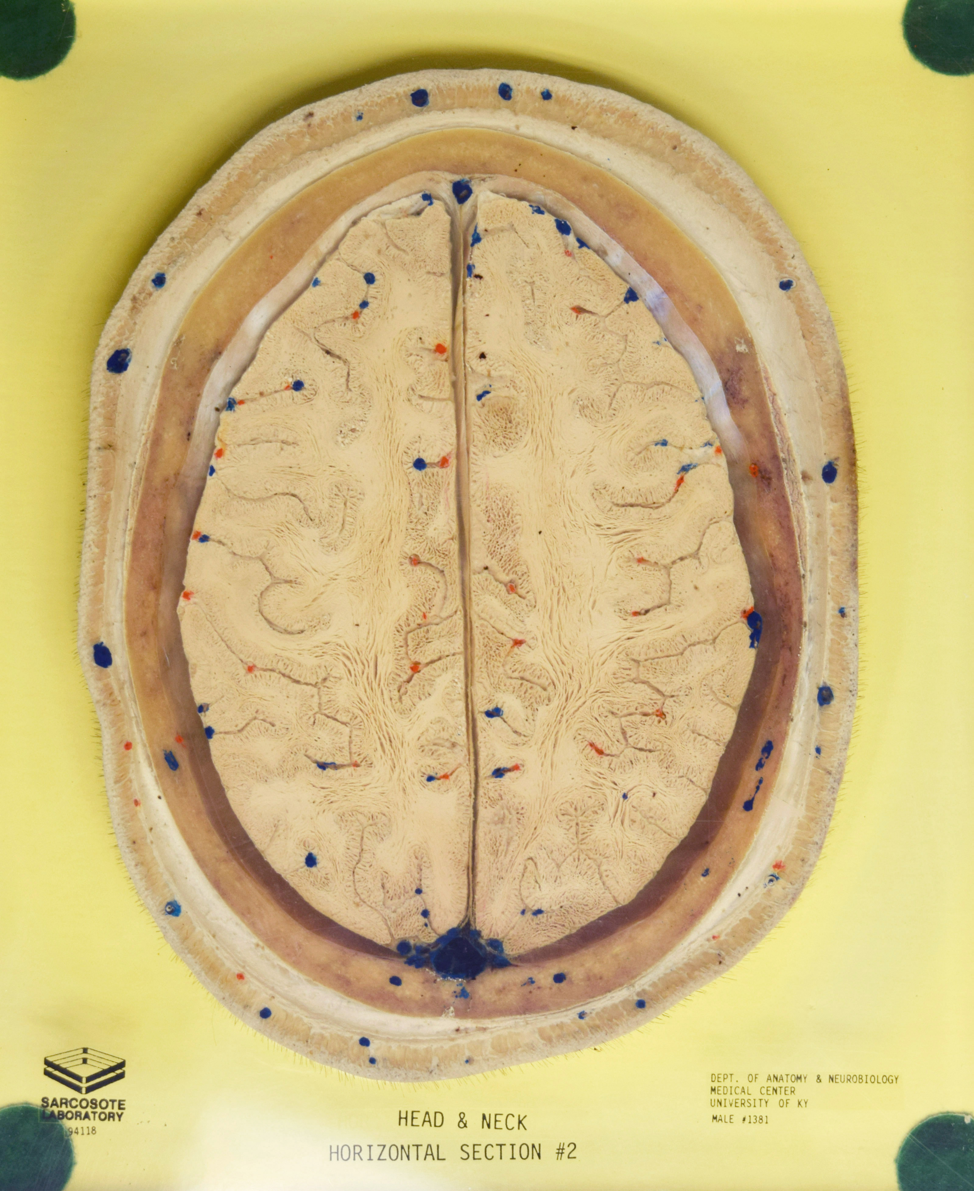 Long Description: Head & neck section, horizontal section 2. Adult male. Painted to indicate veins (blue), arteries (red), and nerves (yellow). View from inferior. Specimen in acrylic. Property of the University of Kentucky Gross Anatomy Lab.