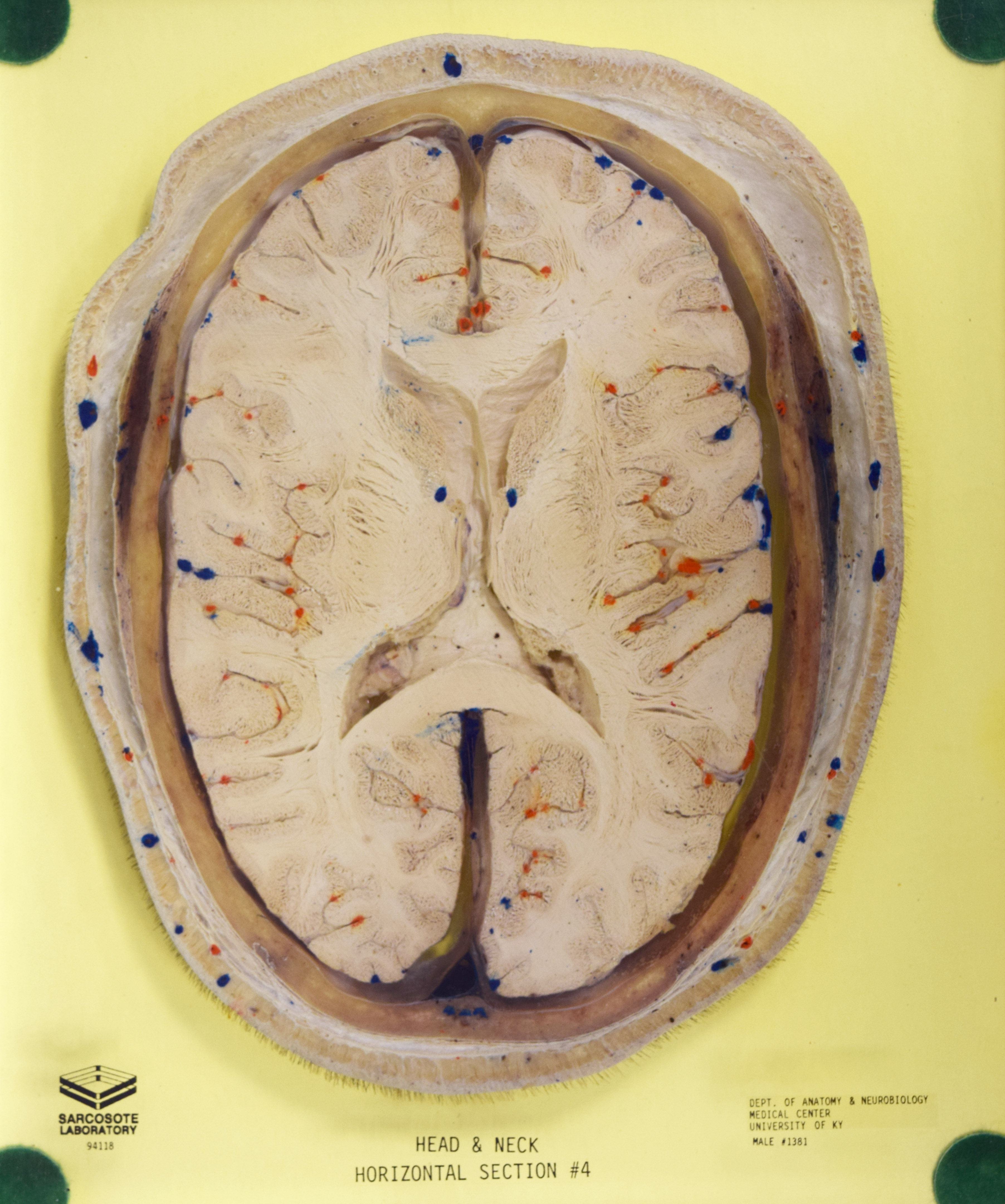 Long Description: Head & neck section, horizontal section 4. Adult male. Painted to indicate veins (blue), arteries (red), and nerves (yellow). View from inferior. Specimen in acrylic. Property of the University of Kentucky Gross Anatomy Lab.