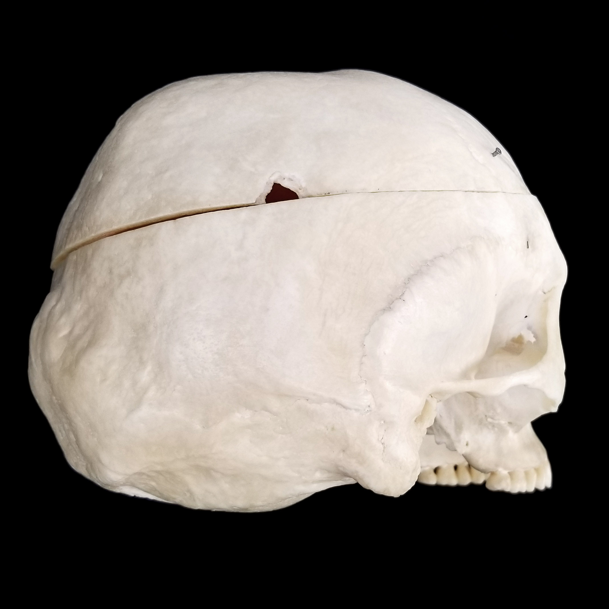 Adult human skull showing closure of sutures. Right posterolateral view. |