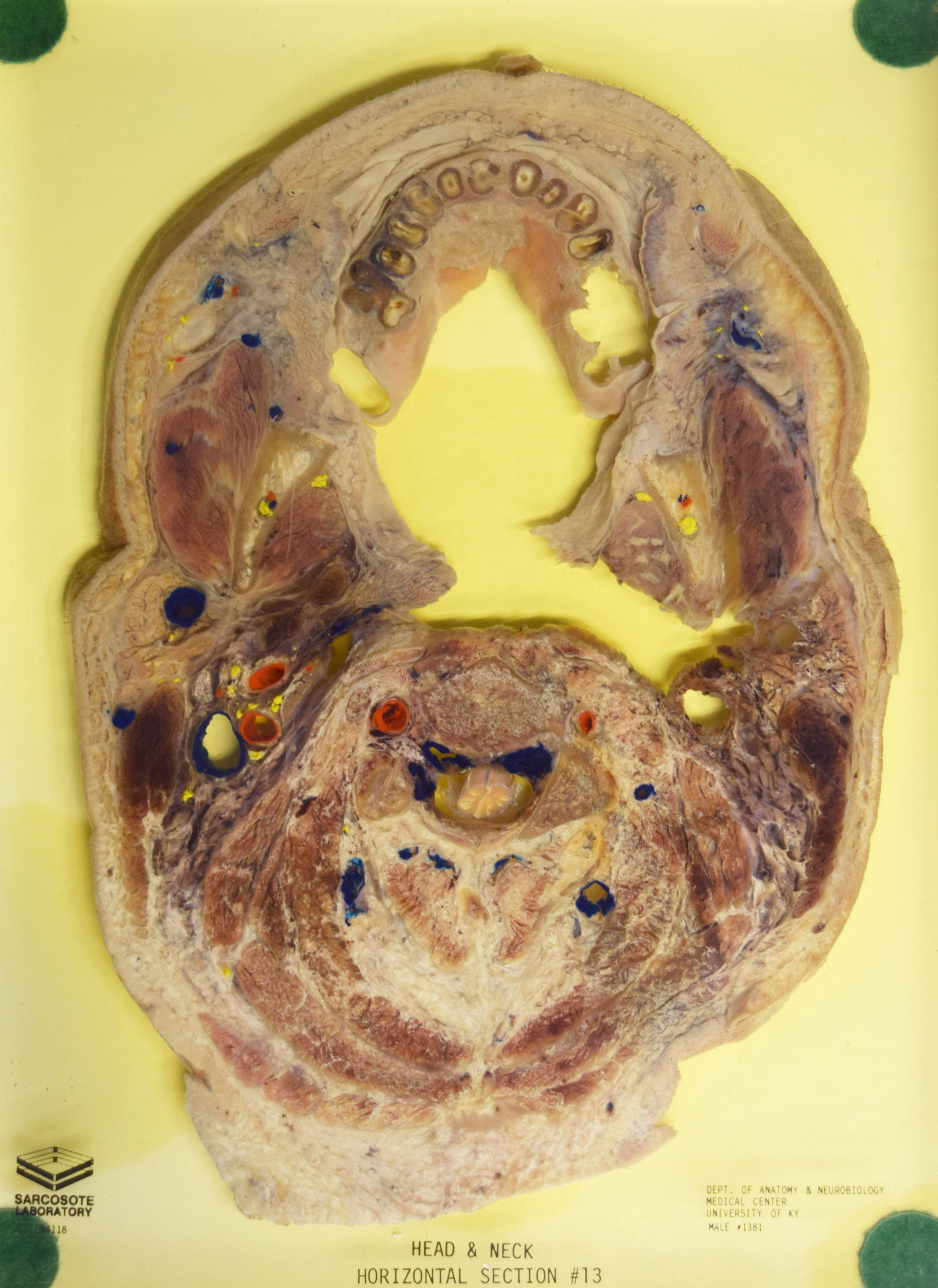 Long Description: Head & neck section, horizontal section 13. Adult male. Painted to indicate veins (blue), arteries (red), and nerves (yellow). View from inferior. Specimen in acrylic. Property of the University of Kentucky Gross Anatomy Lab.