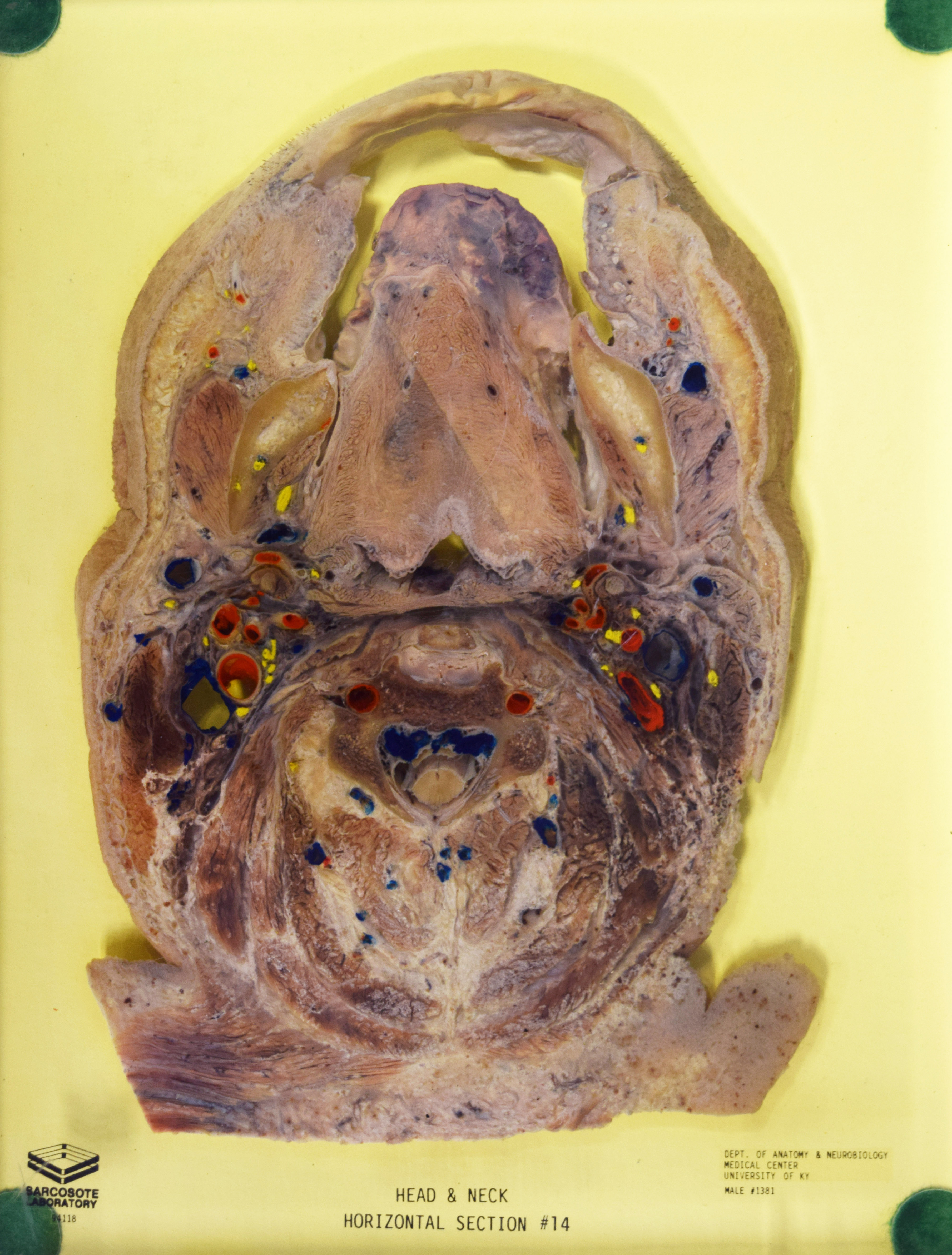 Long Description: Head & neck section, horizontal section 14. Adult male. Painted to indicate veins (blue), arteries (red), and nerves (yellow). View from inferior. Specimen in acrylic. Property of the University of Kentucky Gross Anatomy Lab.