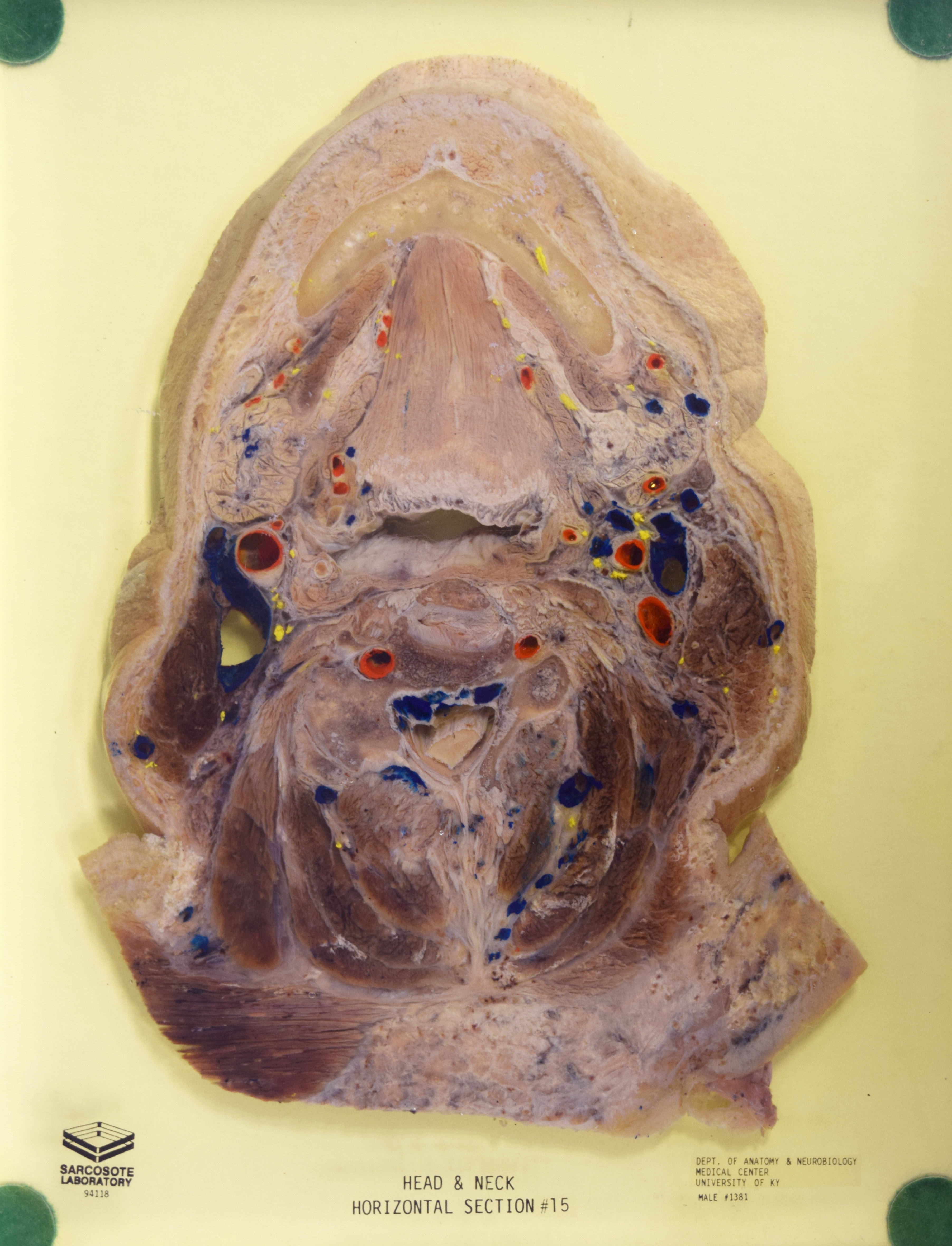 Long Description: Head & neck section, horizontal section 15. Adult male. Painted to indicate veins (blue), arteries (red), and nerves (yellow). View from inferior. Specimen in acrylic. Property of the University of Kentucky Gross Anatomy Lab.