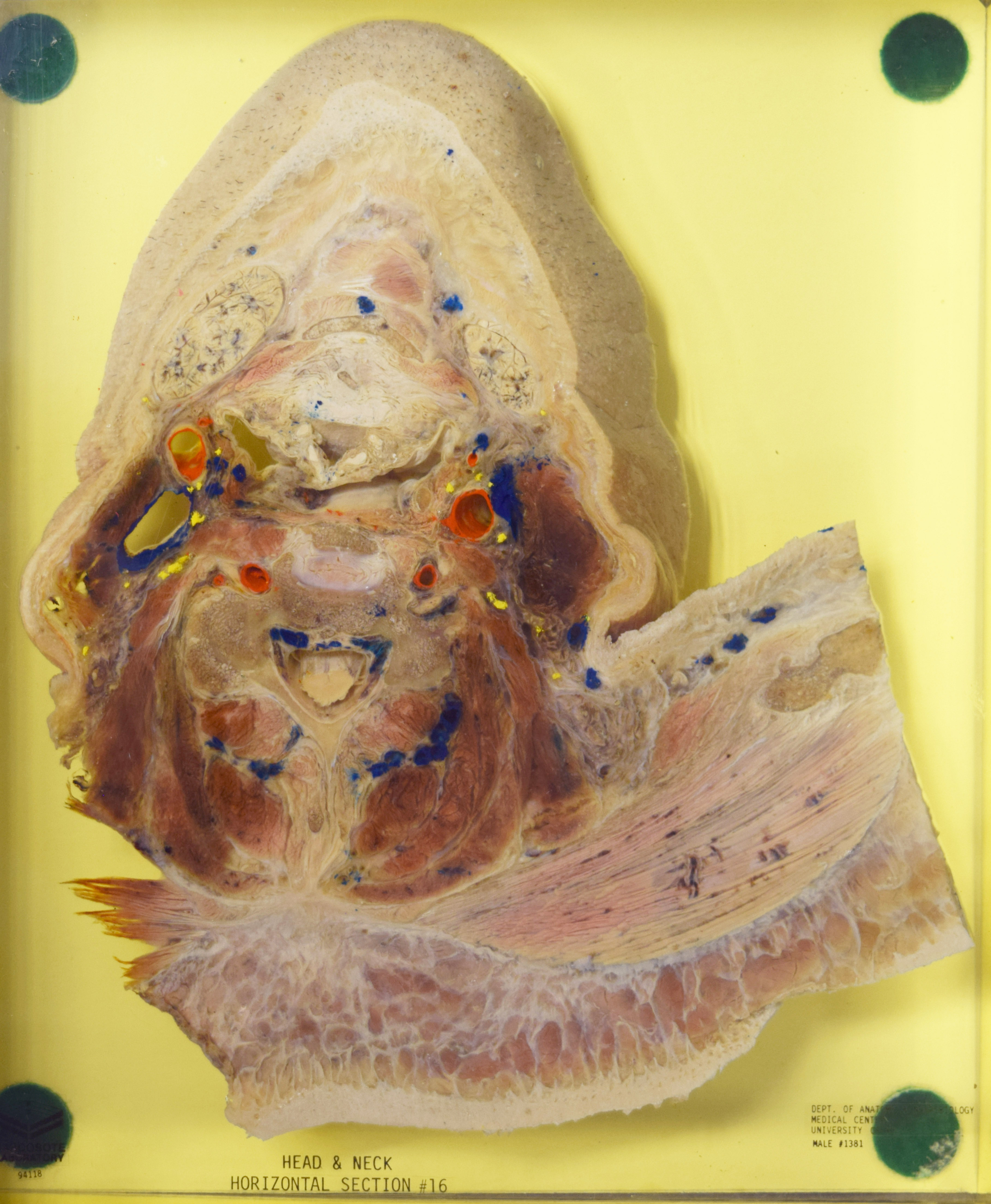 Long Description: Head & neck section, horizontal section 16. Adult male. Painted to indicate veins (blue), arteries (red), and nerves (yellow). View from inferior. Specimen in acrylic. Property of the University of Kentucky Gross Anatomy Lab.