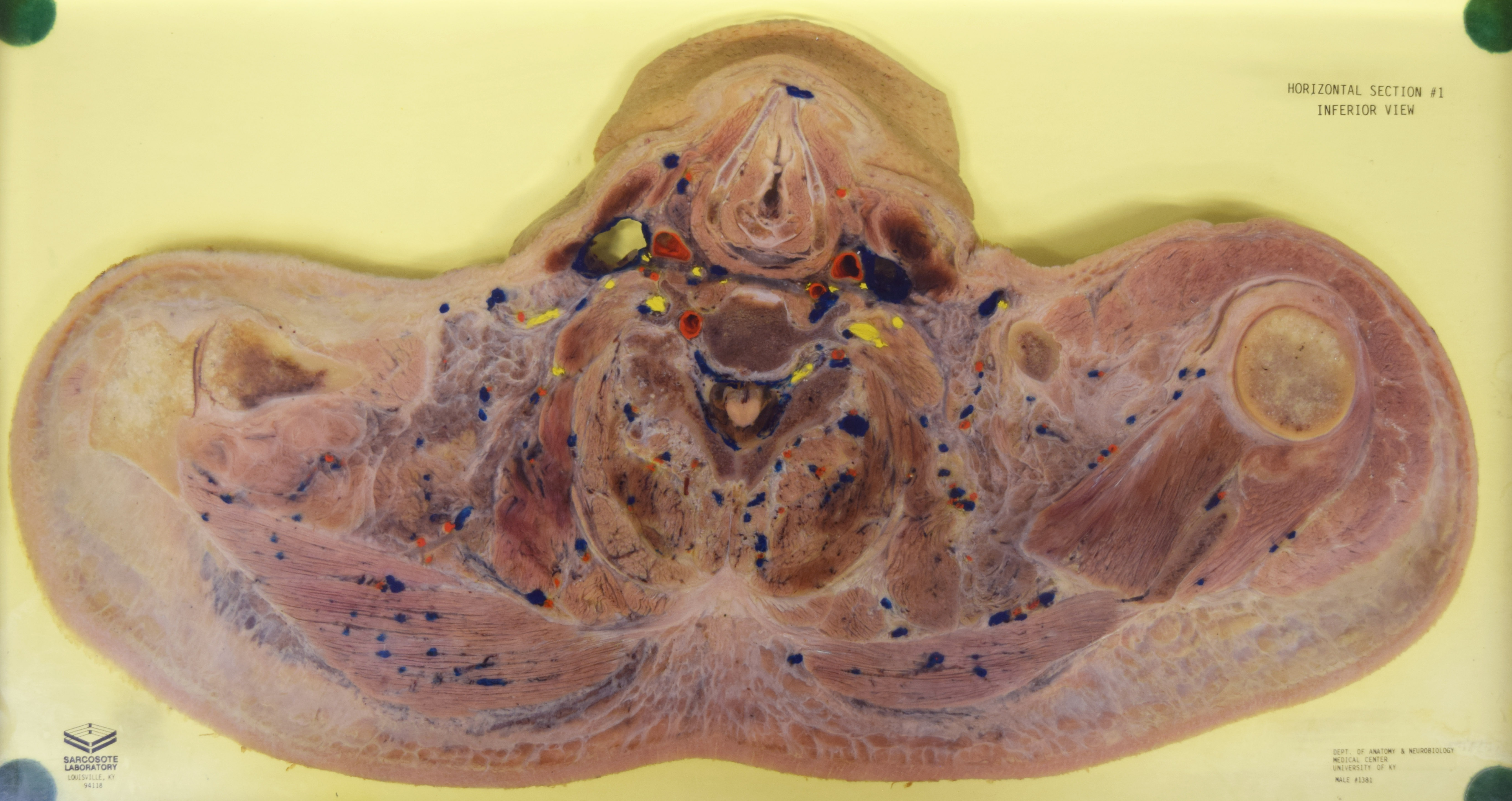 Long Description: Torso, horizontal section 1. Adult male. Painted to indicate veins (blue), arteries (red), and nerves (yellow). View from inferior. Specimen in acrylic. Property of the University of Kentucky Gross Anatomy Lab.
