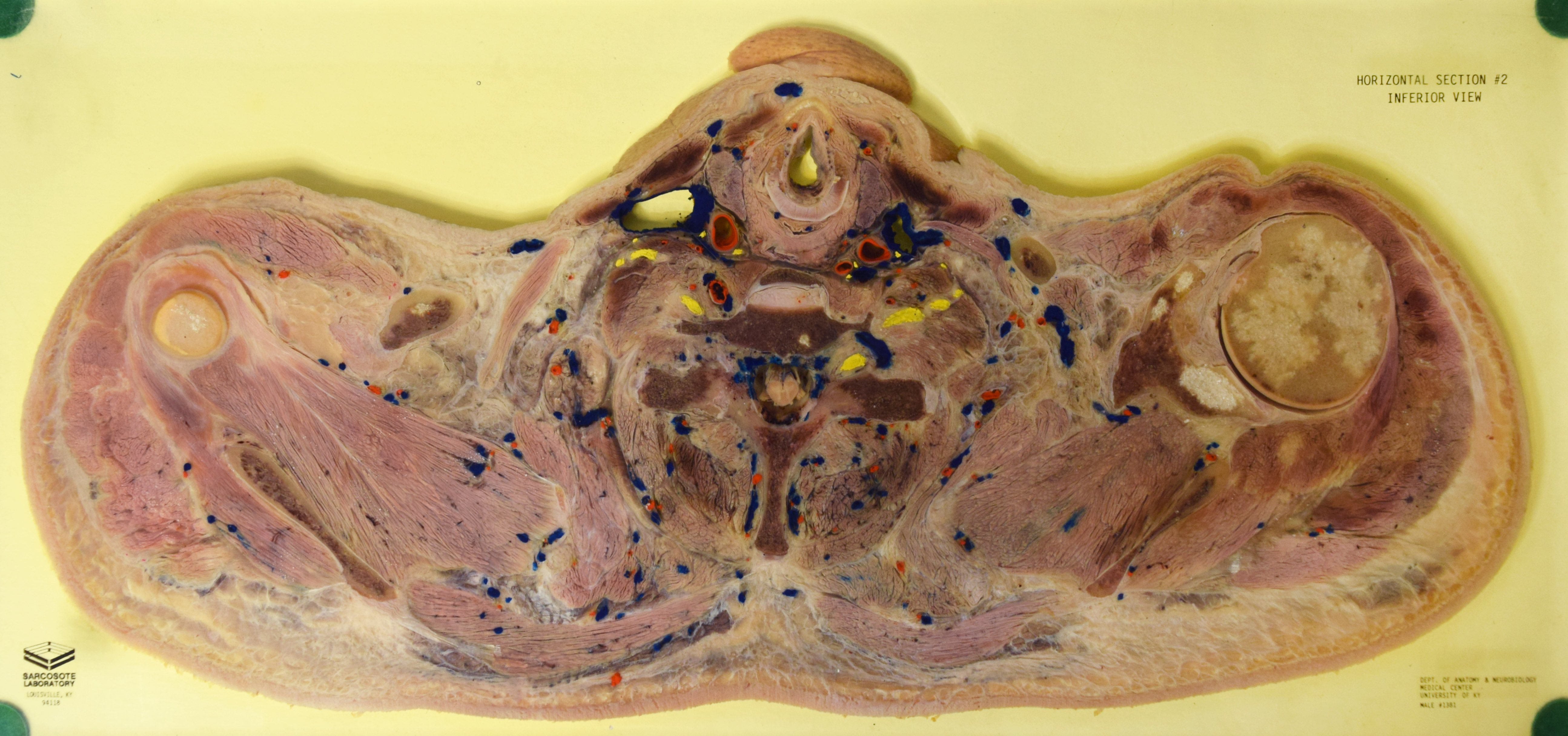 Long Description: Torso, horizontal section 2. Adult male. Painted to indicate veins (blue), arteries (red), and nerves (yellow). View from inferior. Specimen in acrylic. Property of the University of Kentucky Gross Anatomy Lab.