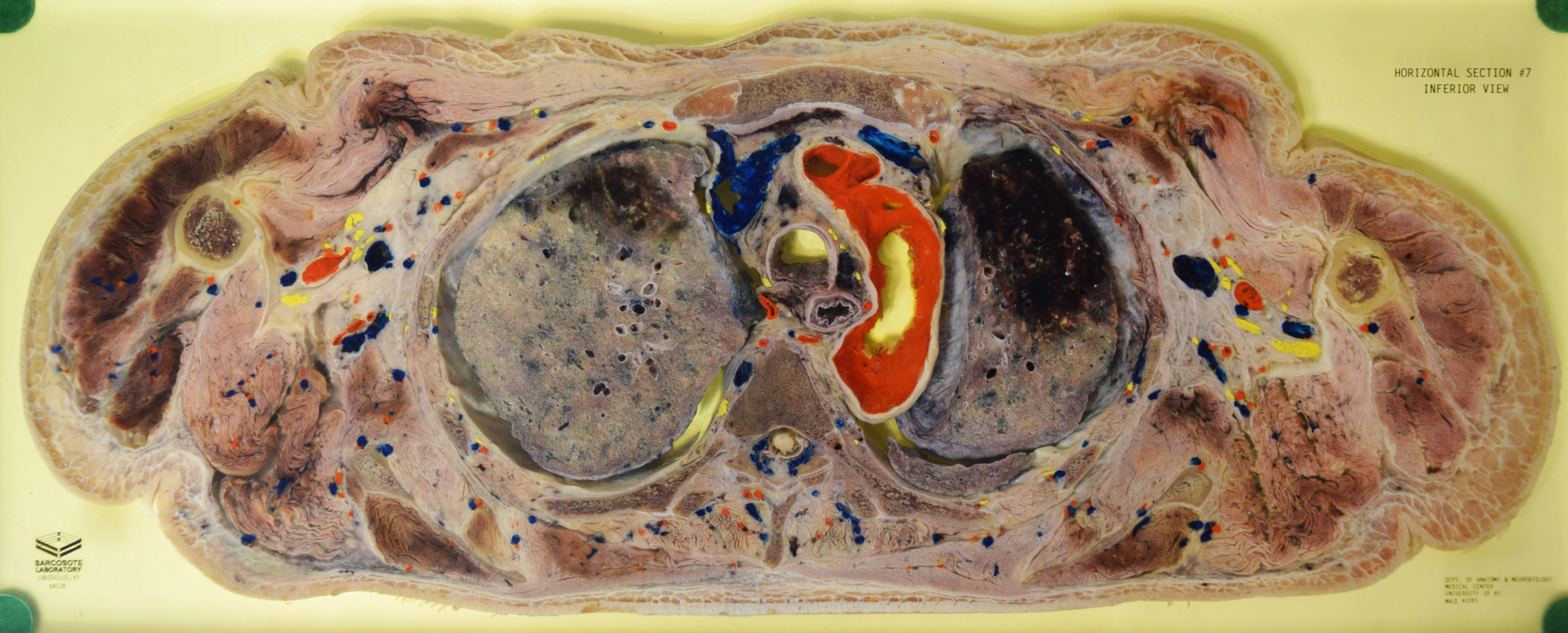 Long Description: Torso, horizontal section 7. Adult male. Painted to indicate veins (blue), arteries (red), and nerves (yellow). View from inferior. Specimen in acrylic. Property of the University of Kentucky Gross Anatomy Lab.