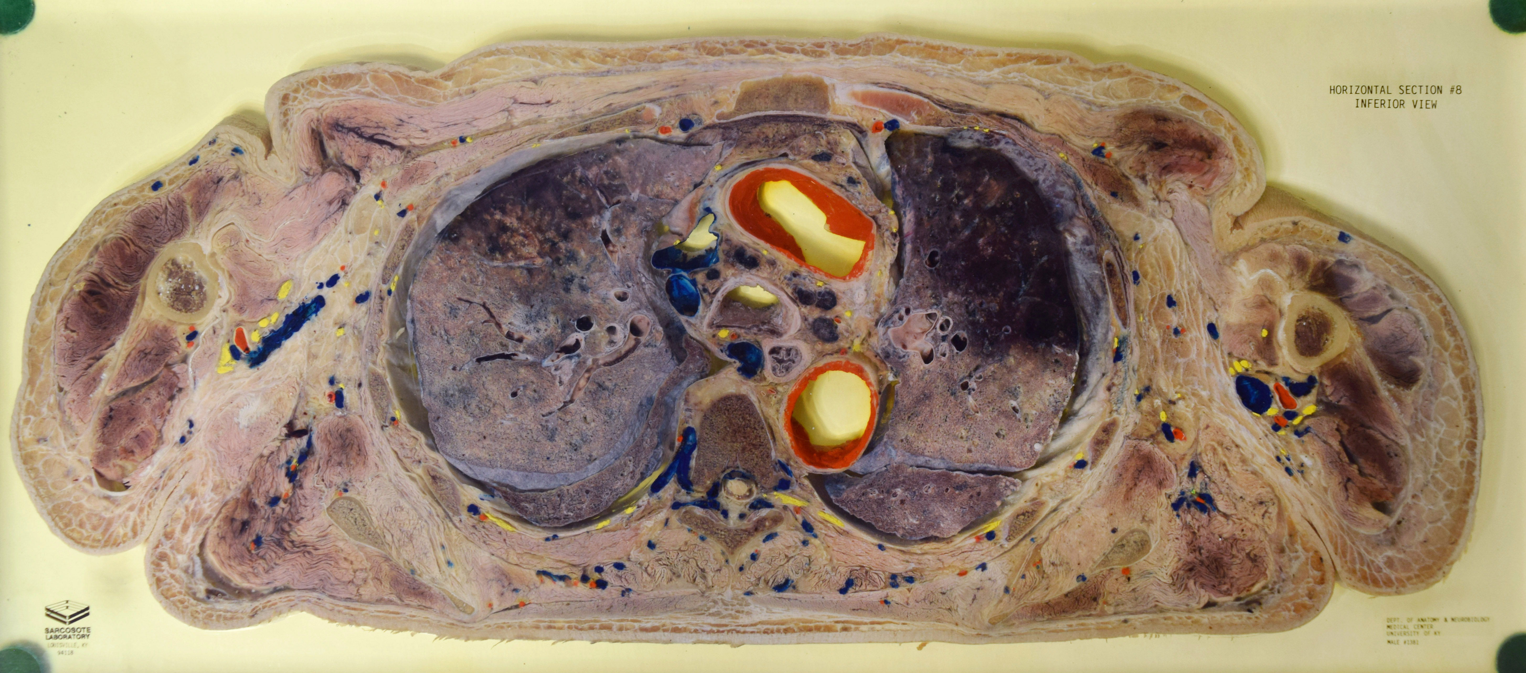 Long Description: Torso, horizontal section 8. Adult male. Painted to indicate veins (blue), arteries (red), and nerves (yellow). View from inferior. Specimen in acrylic. Property of the University of Kentucky Gross Anatomy Lab.