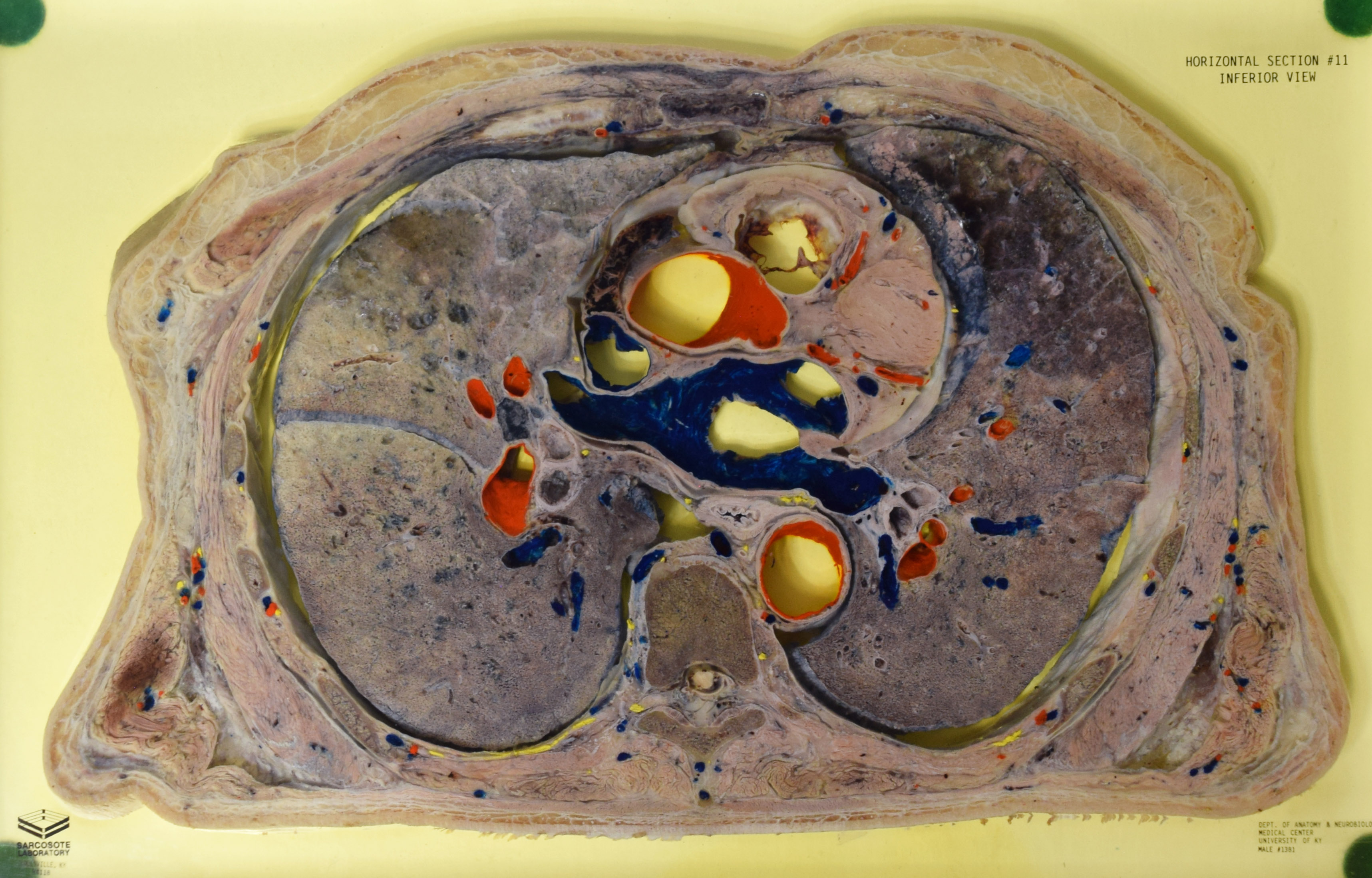 Long Description: Torso, horizontal section 11. Adult male. Painted to indicate veins (blue), arteries (red), and nerves (yellow). View from inferior. Specimen in acrylic. Property of the University of Kentucky Gross Anatomy Lab.