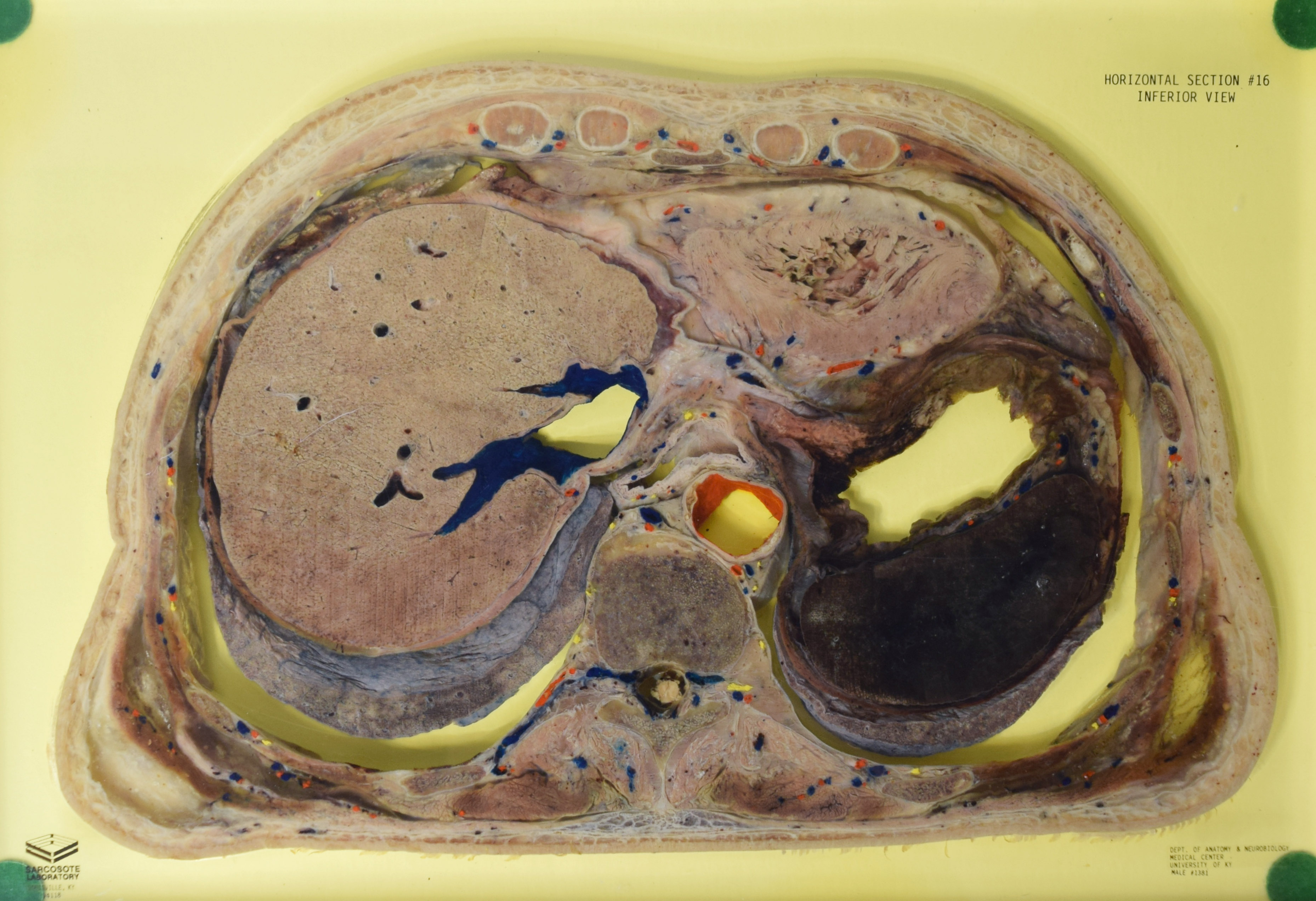 Long Description: Torso, horizontal section 16. Adult male. Painted to indicate veins (blue), arteries (red), and nerves (yellow). View from inferior. Specimen in acrylic. Property of the University of Kentucky Gross Anatomy Lab.