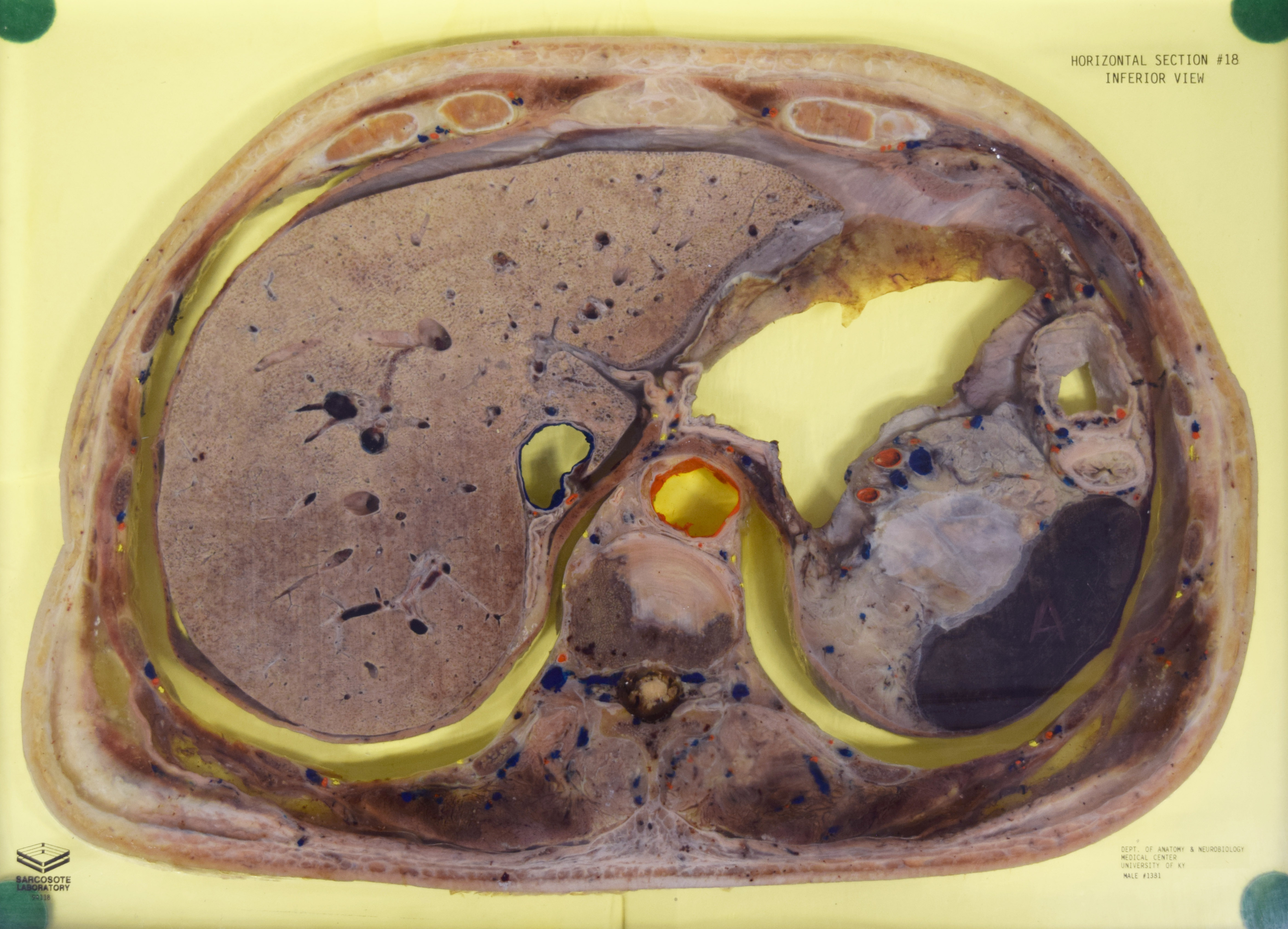 Long Description: Torso, horizontal section 18. Adult male. Painted to indicate veins (blue), arteries (red), and nerves (yellow). View from inferior. Specimen in acrylic. Property of the University of Kentucky Gross Anatomy Lab.