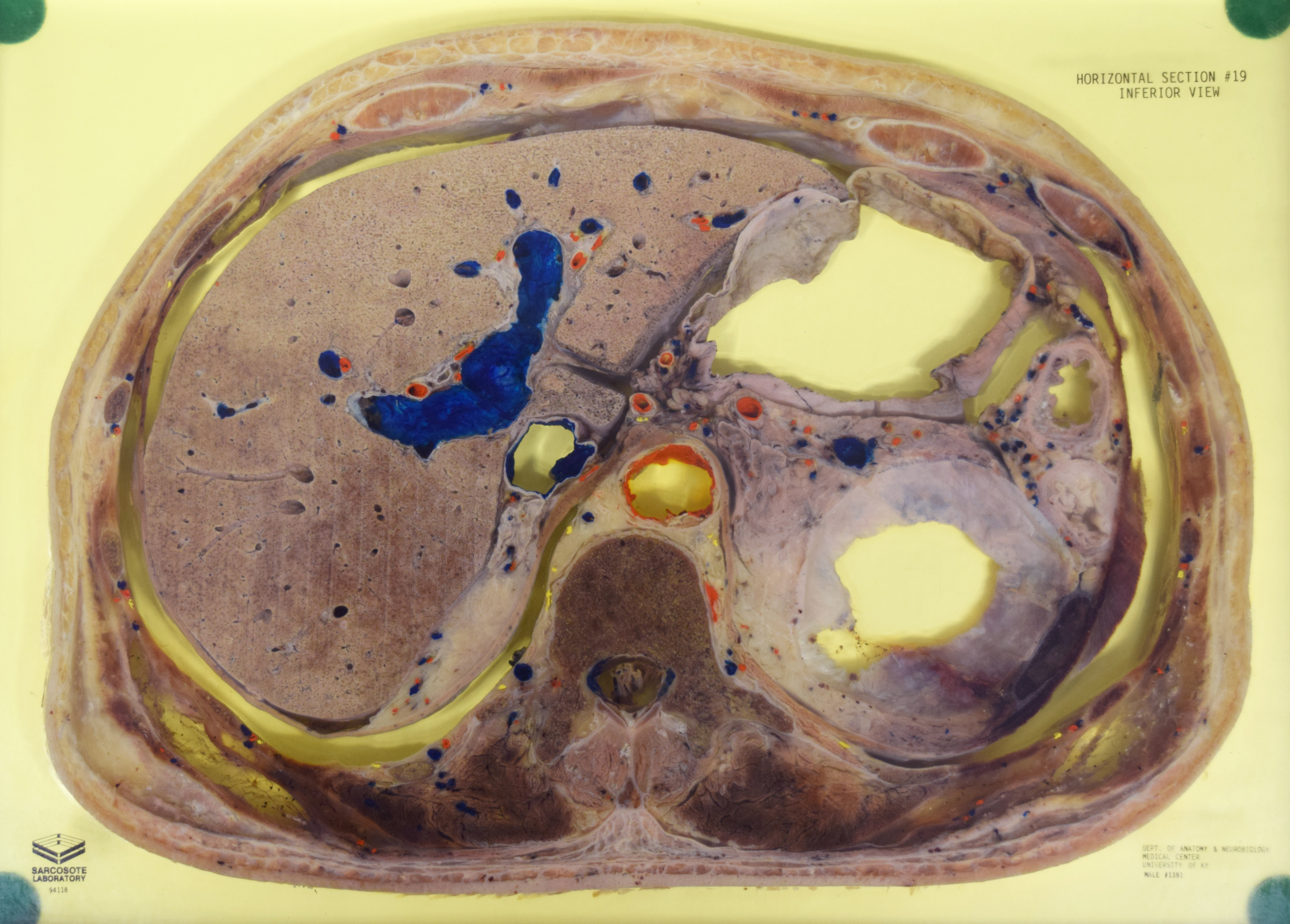 Torso, horizontal section 19. Adult male. Cyst on left kidney (image right). Painted to indicate veins (blue), arteries (red), and nerves (yellow). View from inferior. Specimen in acrylic. Property of the University of Kentucky Gross Anatomy Lab. |