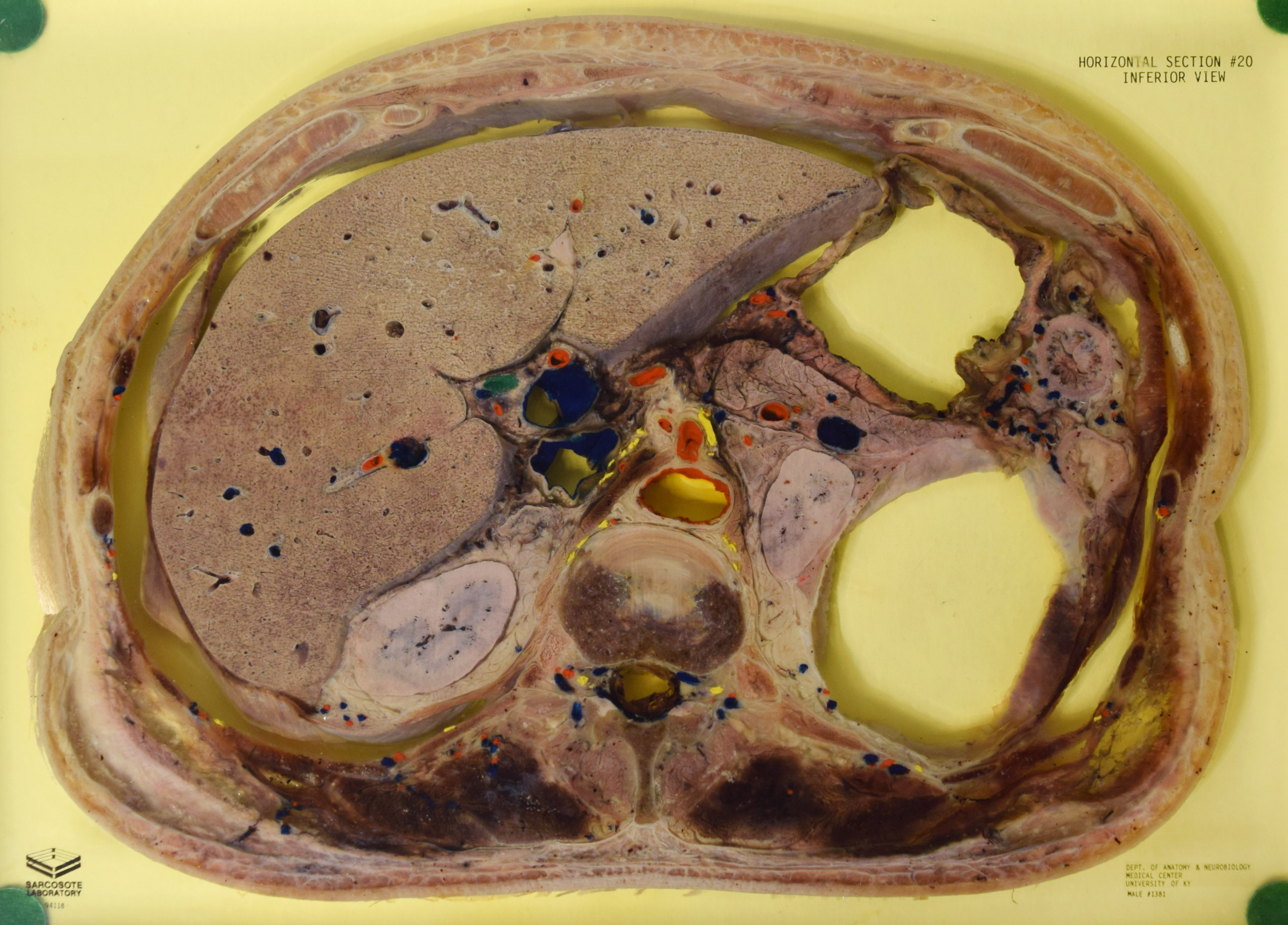Long Description: Torso, horizontal section 20. Adult male. Painted to indicate veins (blue), arteries (red), and nerves (yellow). View from inferior. Specimen in acrylic. Property of the University of Kentucky Gross Anatomy Lab.