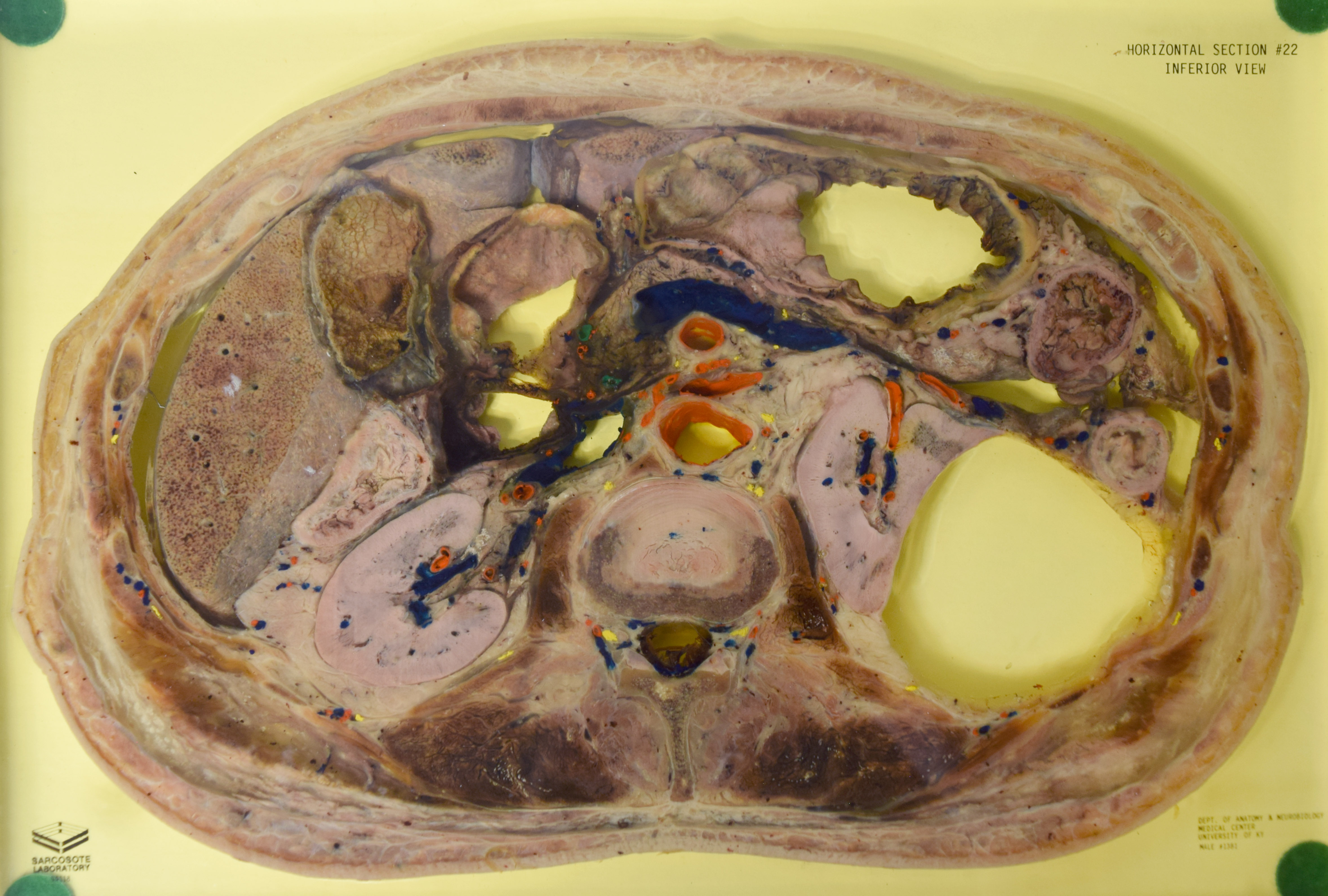 Long Description: Torso, horizontal section 22. Adult male. Painted to indicate veins (blue), arteries (red), and nerves (yellow). View from inferior. Specimen in acrylic. Property of the University of Kentucky Gross Anatomy Lab.