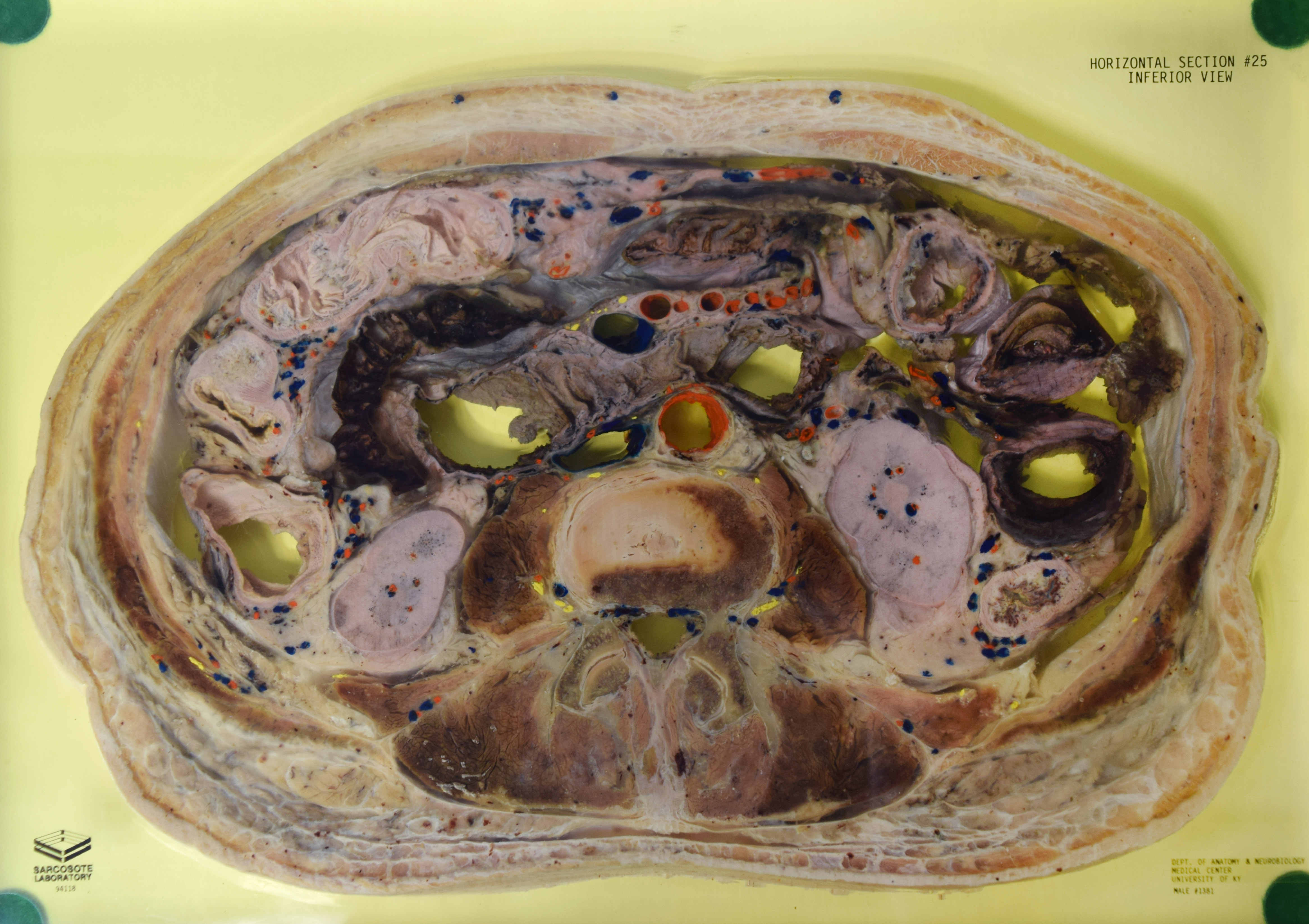 Long Description: Torso, horizontal section 25. Adult male. Painted to indicate veins (blue), arteries (red), and nerves (yellow). View from inferior. Specimen in acrylic. Property of the University of Kentucky Gross Anatomy Lab.