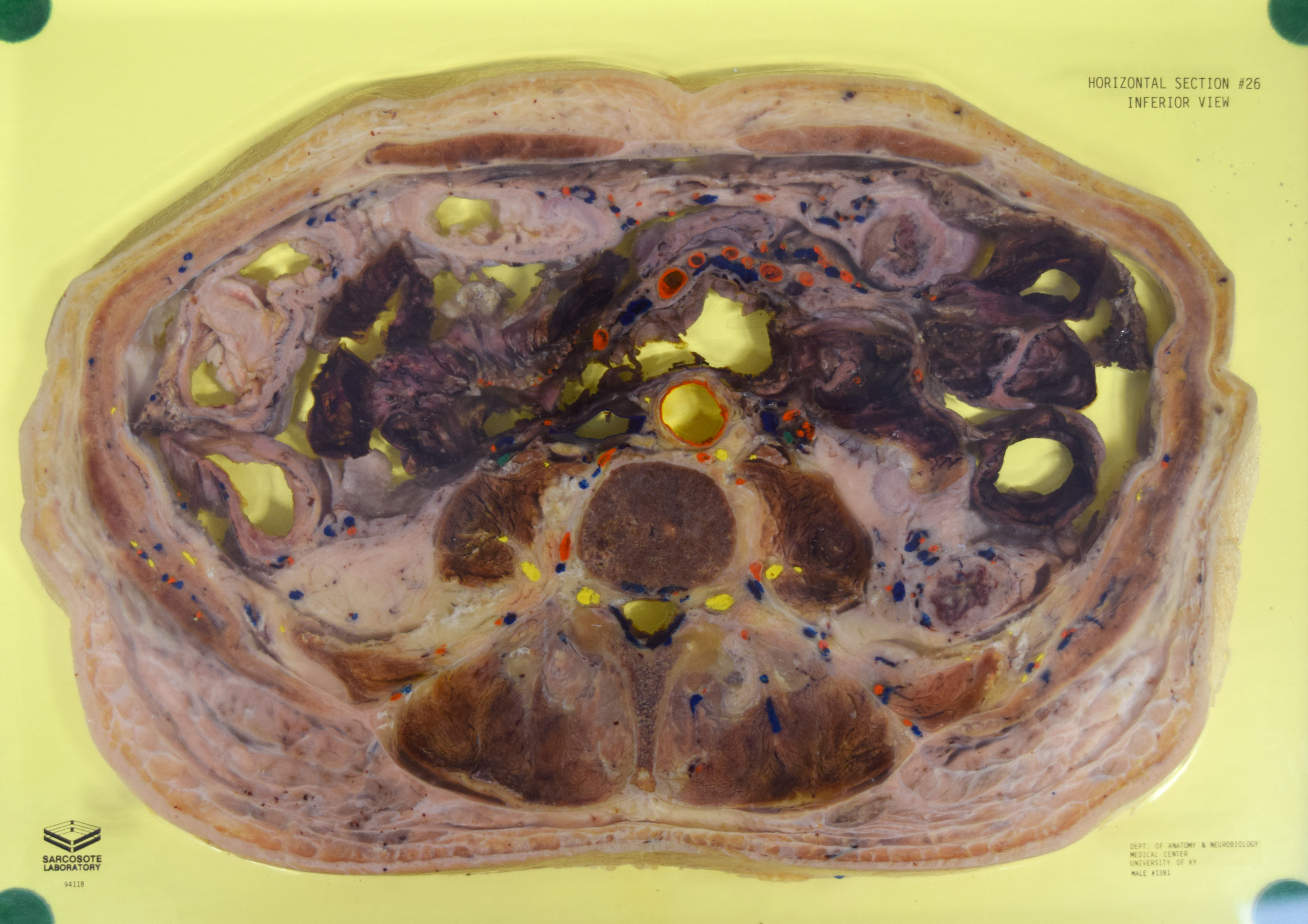 Long Description: Torso, horizontal section 26. Adult male. Painted to indicate veins (blue), arteries (red), and nerves (yellow). View from inferior. Specimen in acrylic. Property of the University of Kentucky Gross Anatomy Lab.