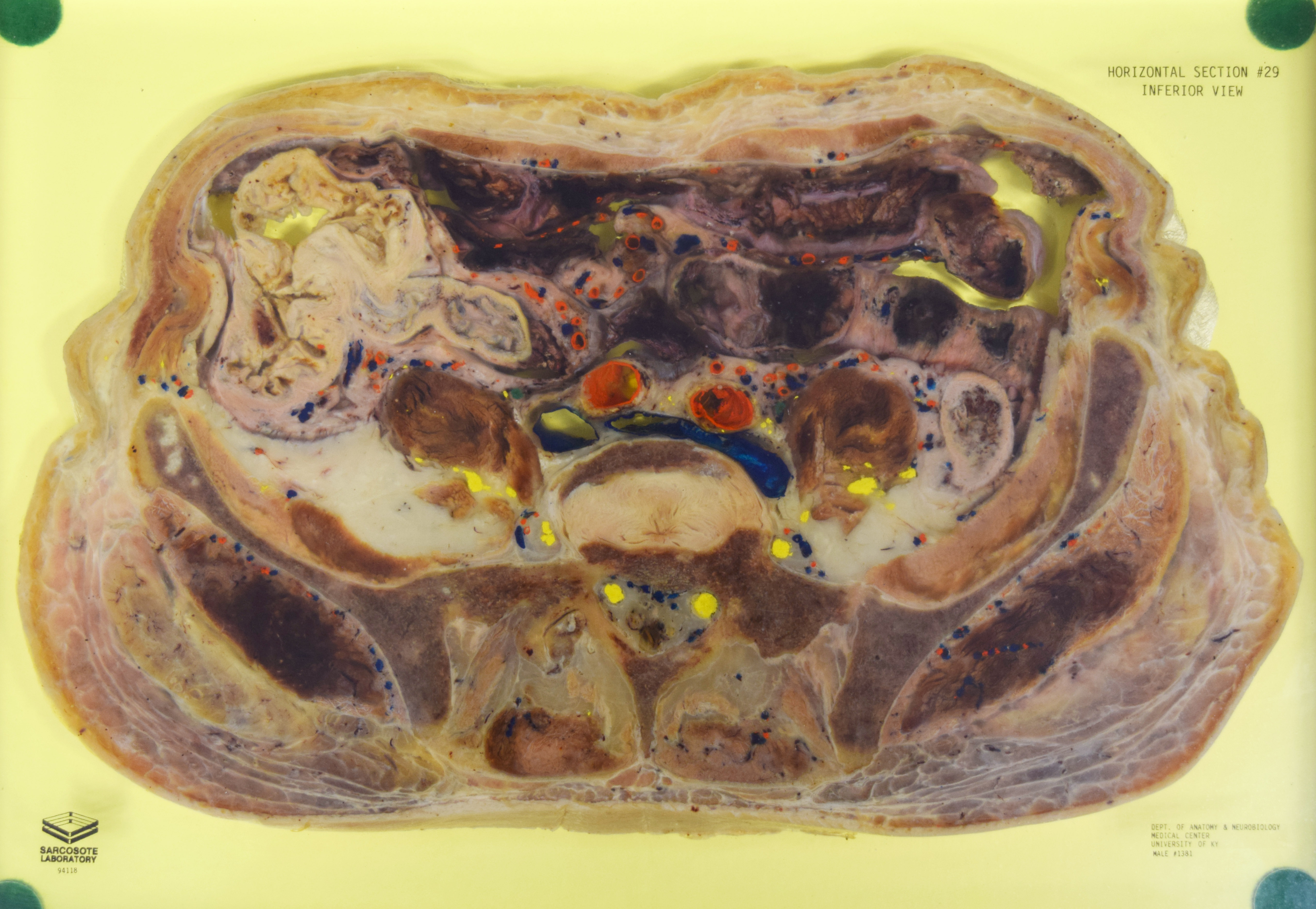 Long Description: Torso, horizontal section 29. Adult male. Painted to indicate veins (blue), arteries (red), and nerves (yellow). View from inferior. Specimen in acrylic. Property of the University of Kentucky Gross Anatomy Lab.