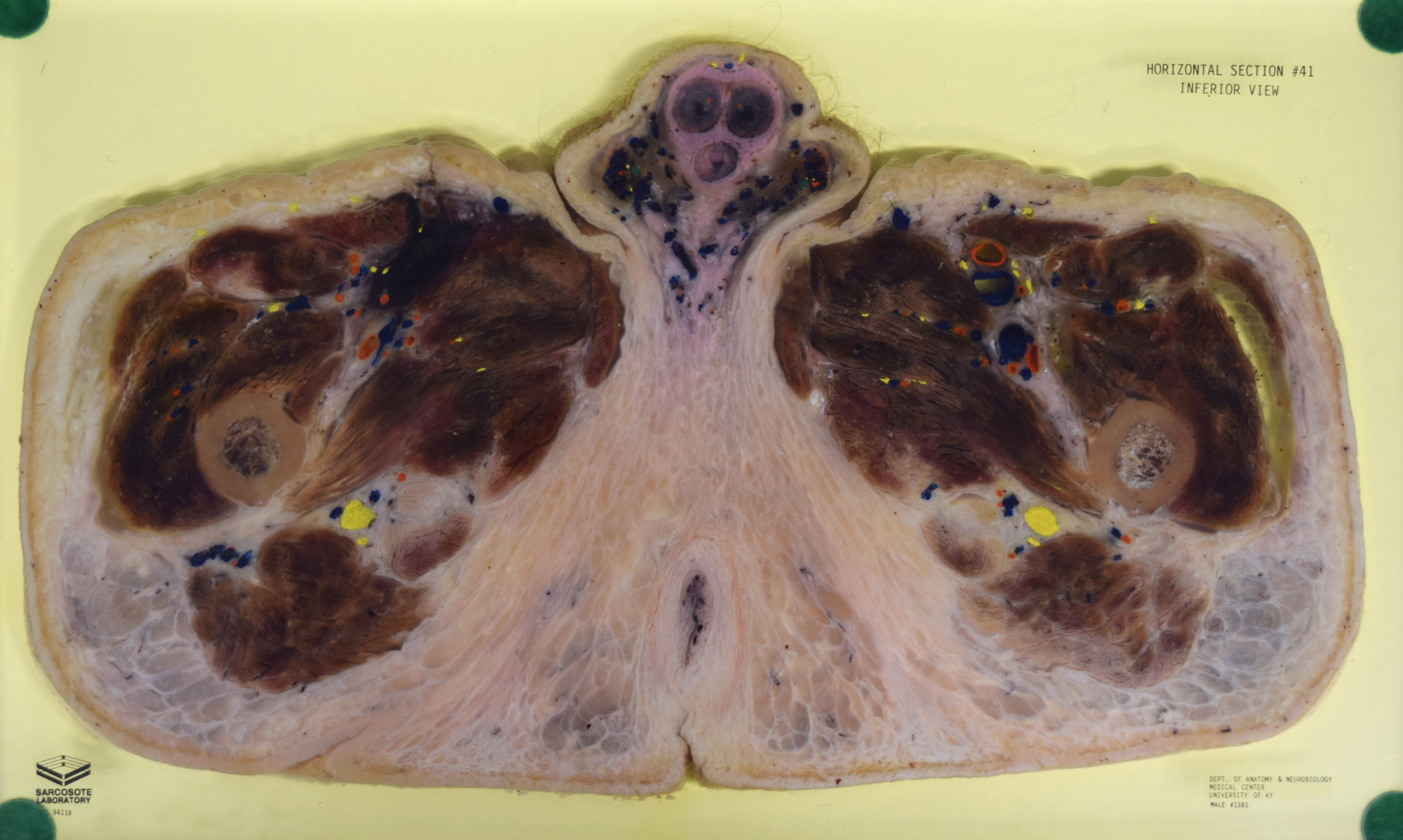 Long Description: Torso, horizontal section 41. Adult male. Painted to indicate veins (blue), arteries (red), and nerves (yellow). View from inferior. Specimen in acrylic. Property of the University of Kentucky Gross Anatomy Lab.