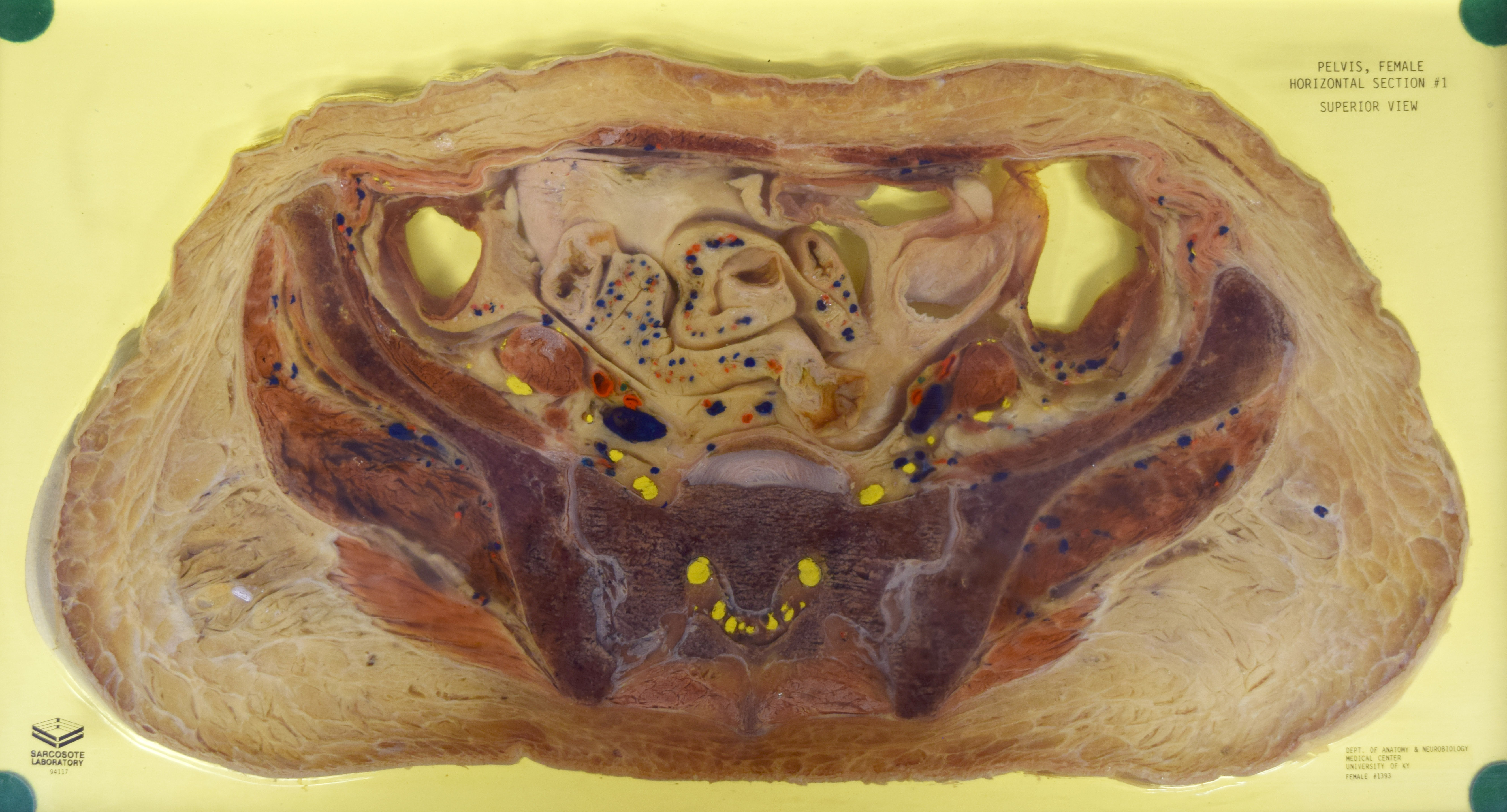 Long Description: Pelvis, horizontal section 1. Adult female. Painted to indicate veins (blue), arteries (red), and nerves (yellow). View from inferior. Specimen in acrylic. Property of the University of Kentucky Gross Anatomy Lab.