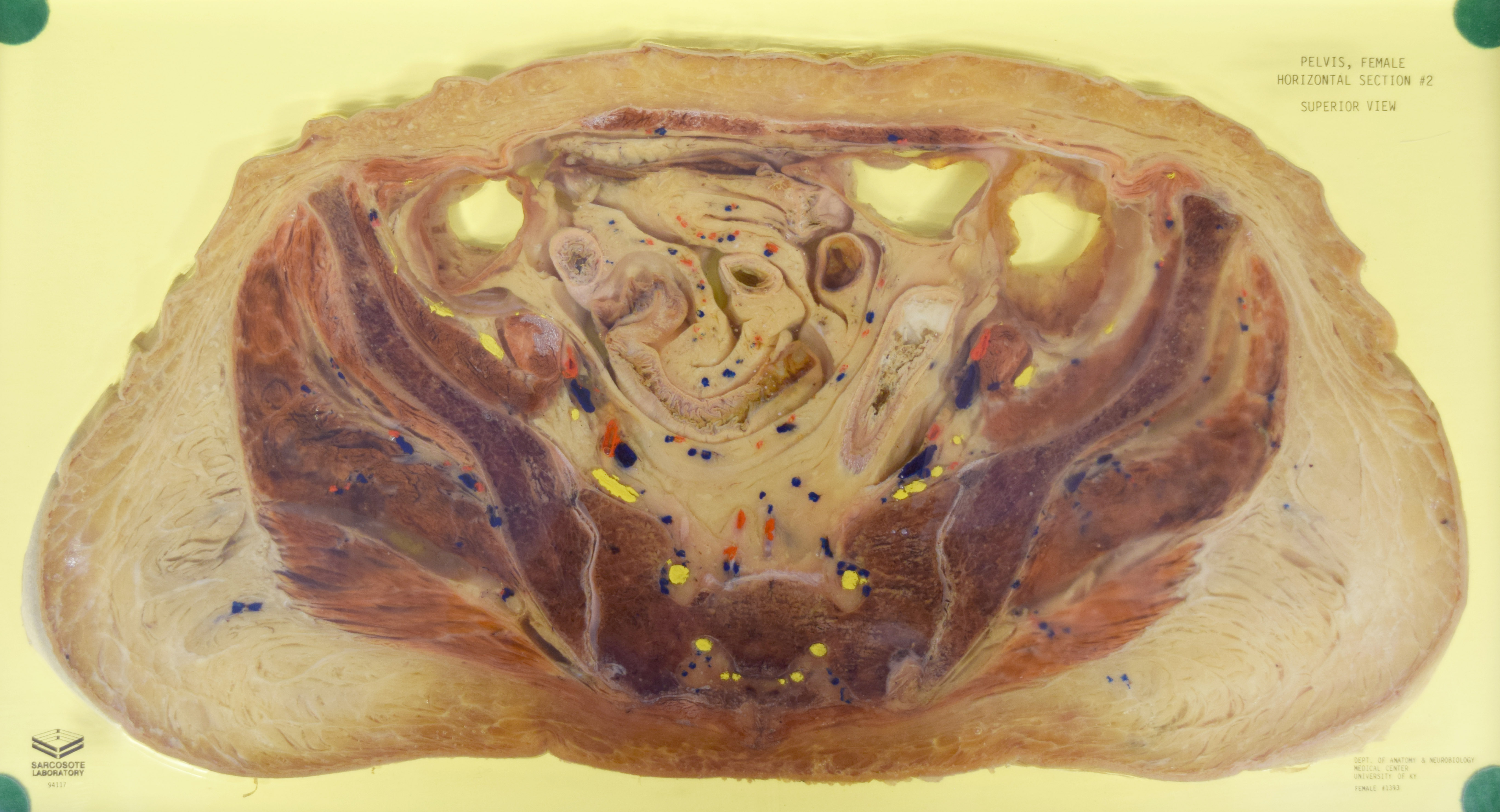 Long Description: Pelvis, horizontal section 2. Adult female. Painted to indicate veins (blue), arteries (red), and nerves (yellow). View from inferior. Specimen in acrylic. Property of the University of Kentucky Gross Anatomy Lab.