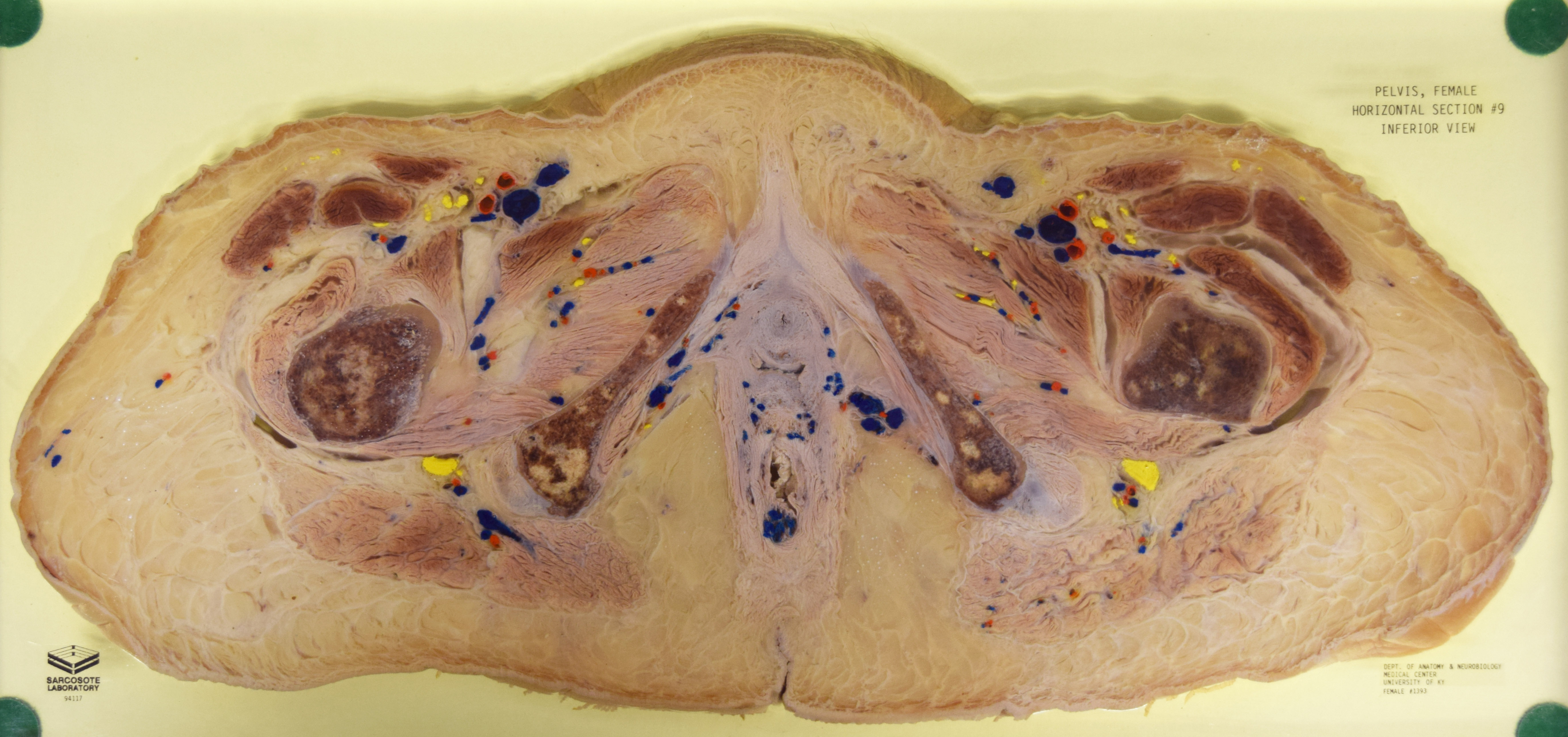 Long Description: Pelvis, horizontal section 9. Adult female. Painted to indicate veins (blue), arteries (red), and nerves (yellow). View from inferior. Specimen in acrylic. Property of the University of Kentucky Gross Anatomy Lab.