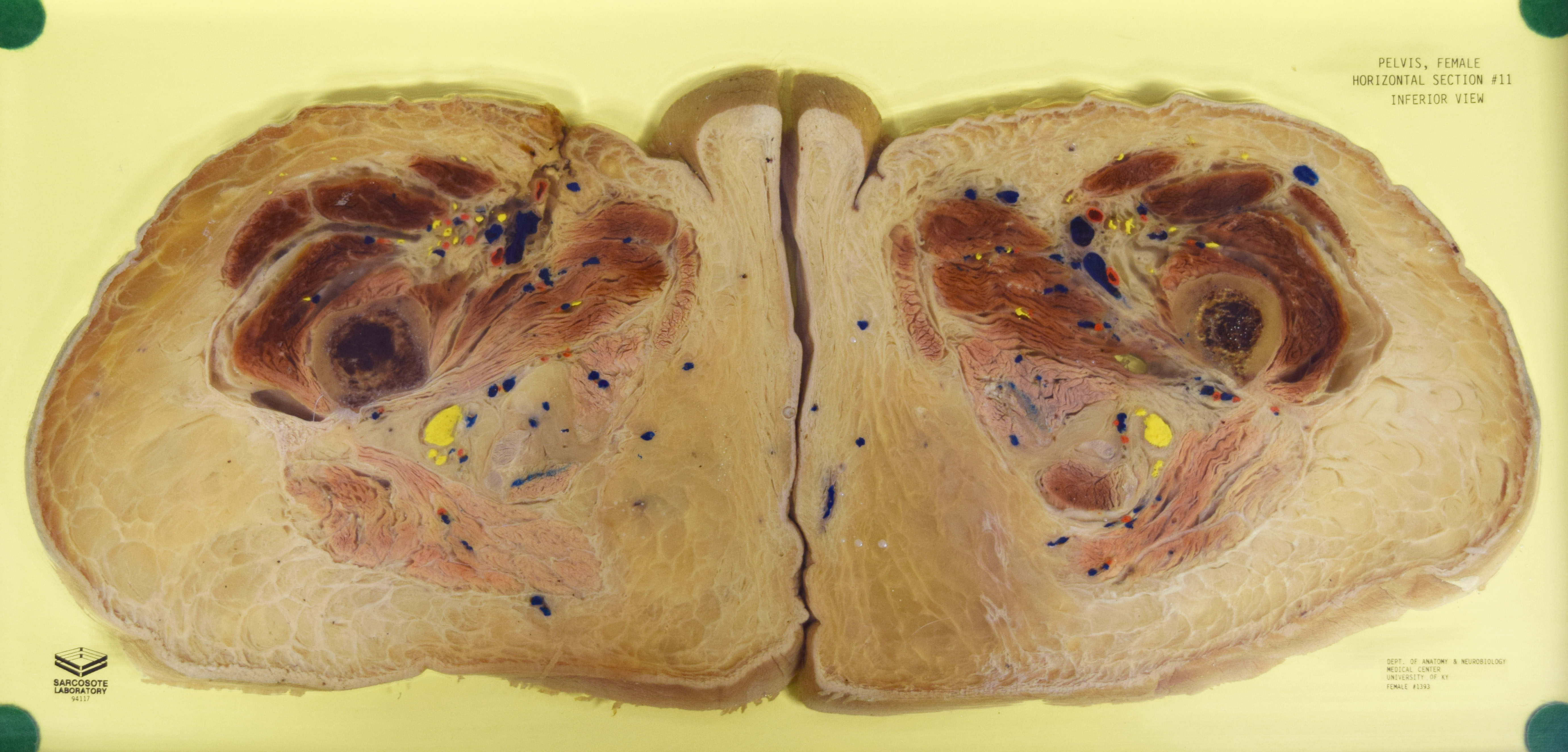 Long Description: Pelvis, horizontal section 11. Adult female. Painted to indicate veins (blue), arteries (red), and nerves (yellow). View from inferior. Specimen in acrylic. Property of the University of Kentucky Gross Anatomy Lab.