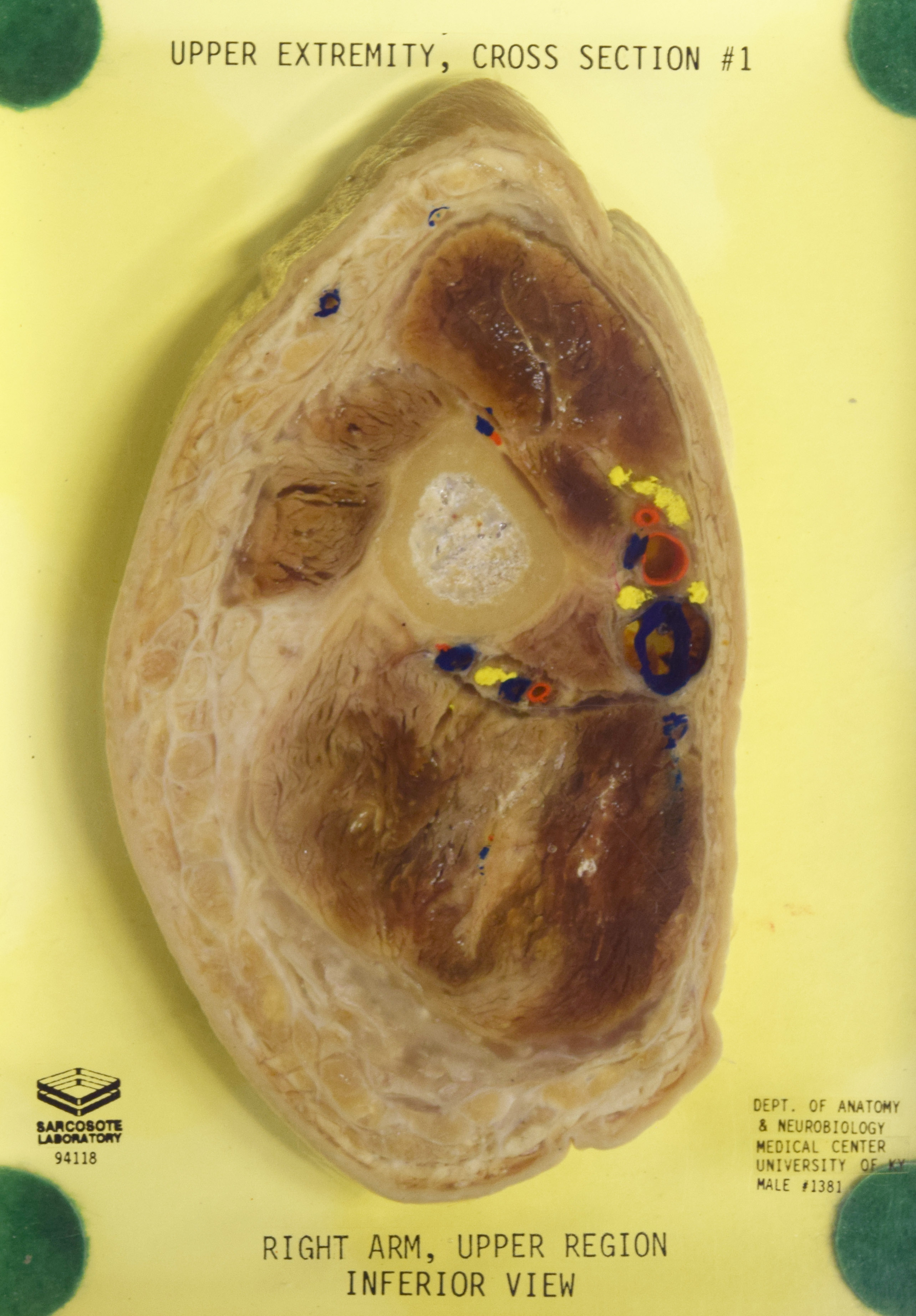 Right upper limb proximal to elbow, horizontal section 1. Adult male. Painted to indicate veins (blue), arteries (red), and nerves (yellow). View from inferior. Specimen in acrylic. Property of the University of Kentucky Gross Anatomy Lab. |