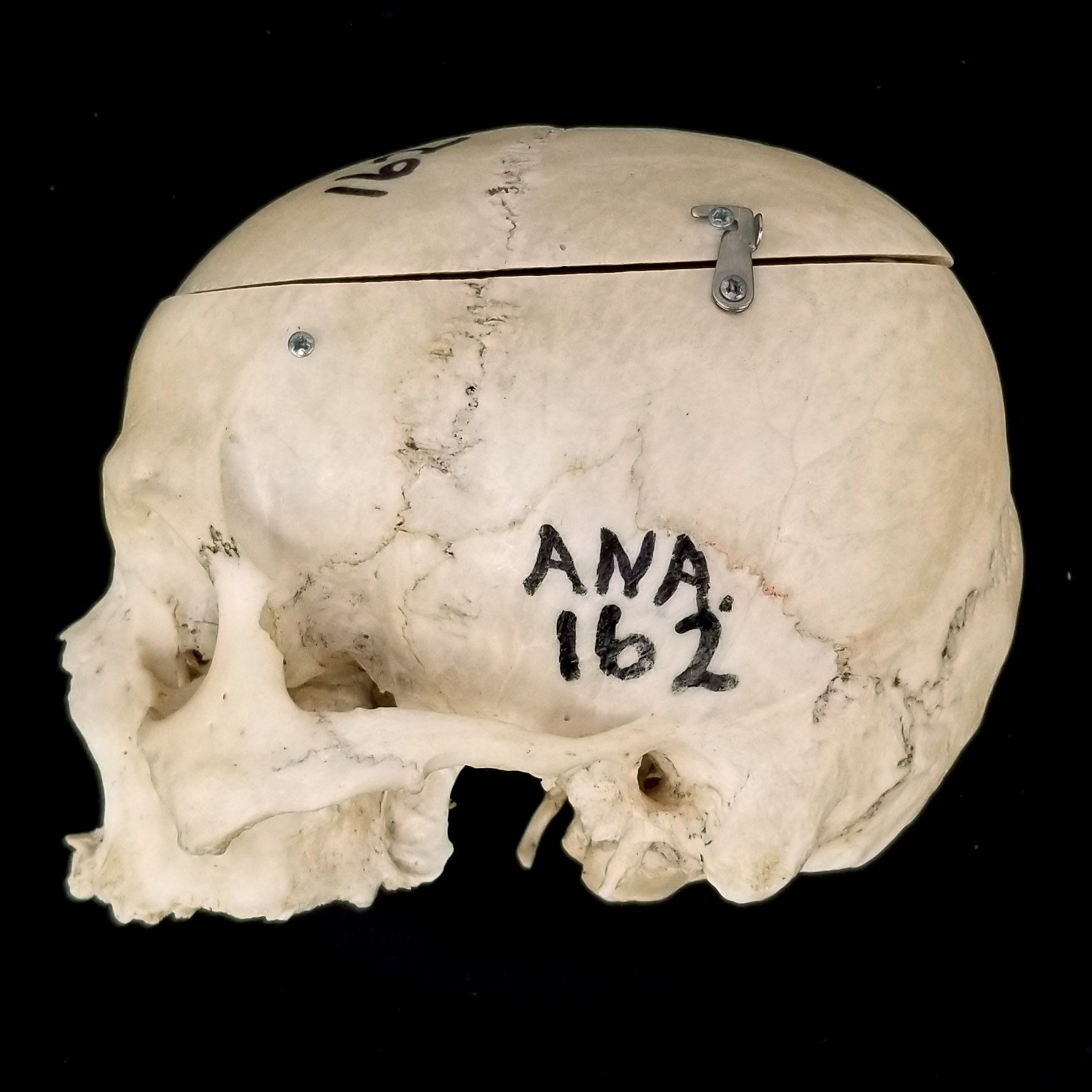 Adult human skull with ossicles in coronal suture. Parietal process of the temporal squama. Partial squamomastoid suture. Partial suture on zygomatic bone. Left lateral view. |