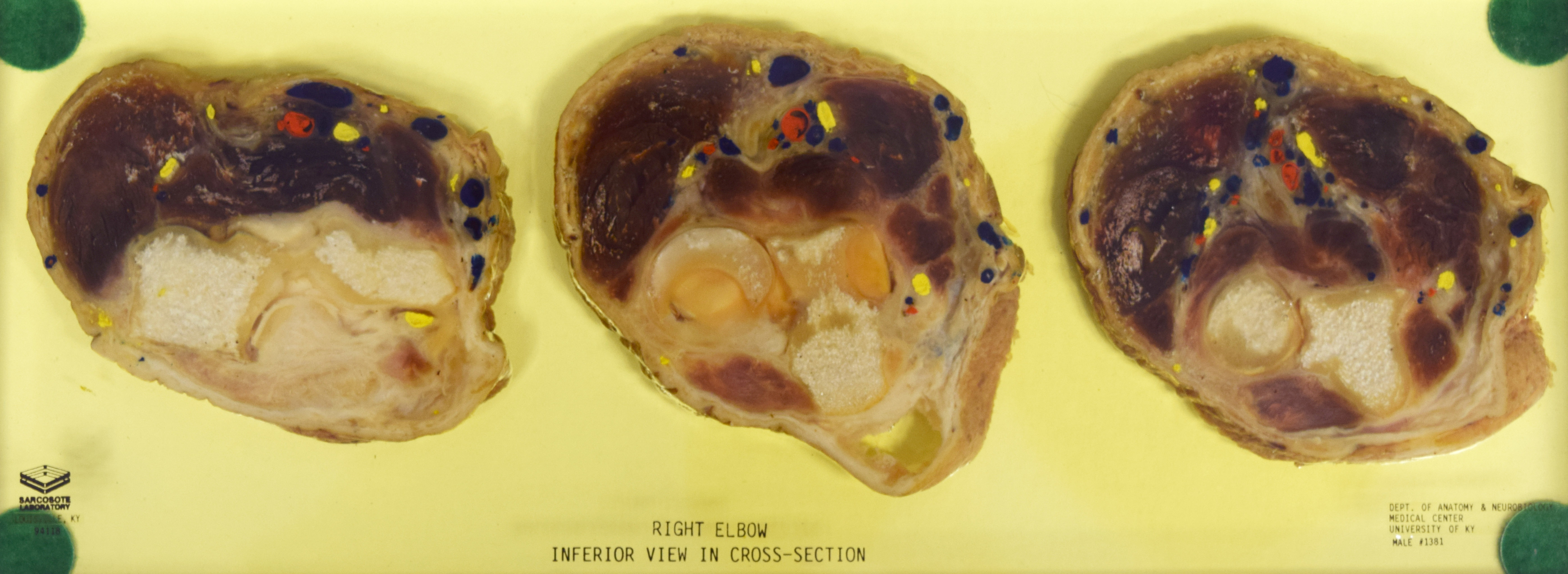 Long Description: Right elbow, horizontal sections. Adult male. Painted to indicate veins (blue), arteries (red), and nerves (yellow). View from inferior. Specimen in acrylic. Property of the University of Kentucky Gross Anatomy Lab.