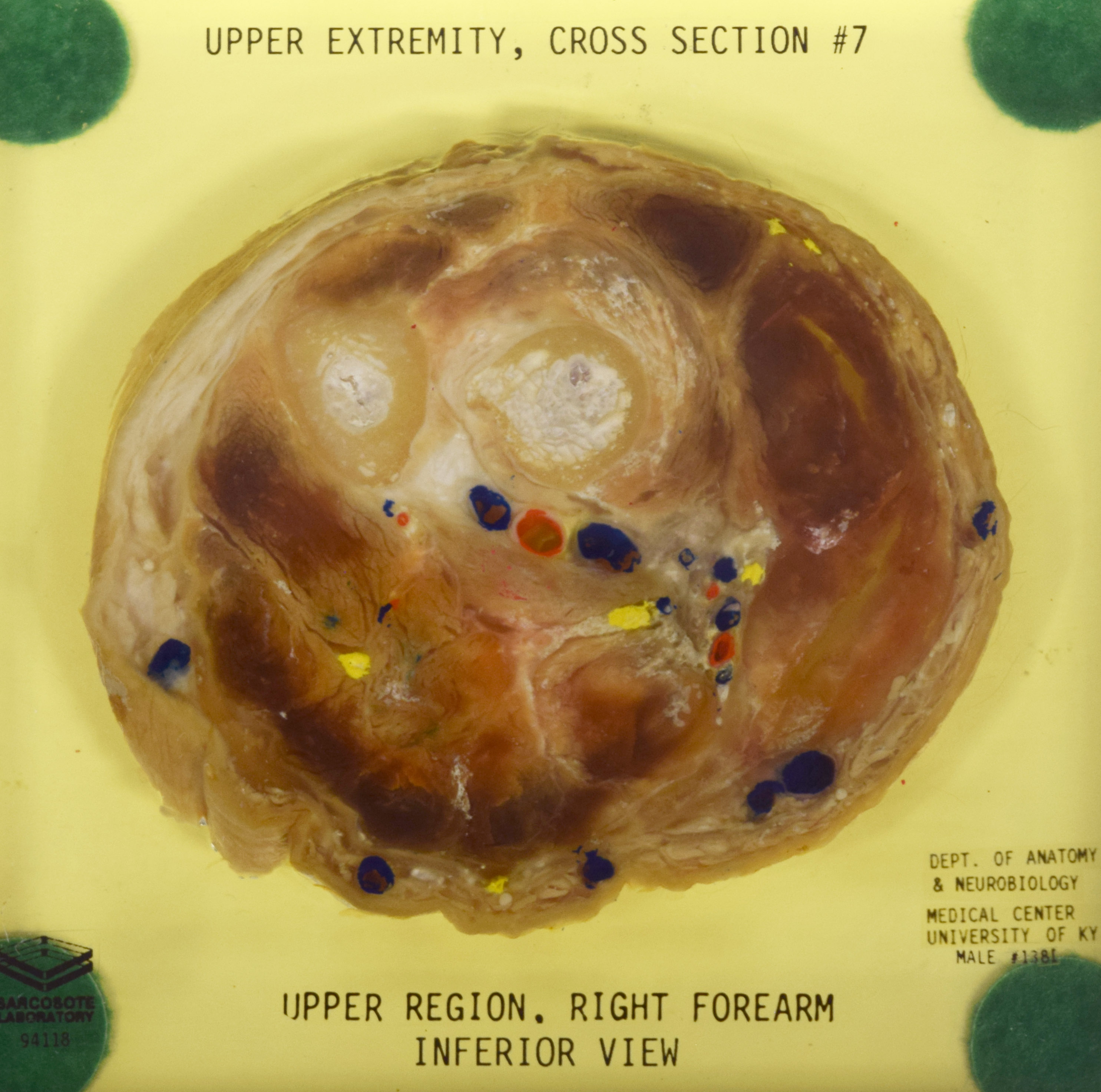 Right upper limb distal to elbow, horizontal section 7. Adult male. Painted to indicate veins (blue), arteries (red), and nerves (yellow). View from inferior. Specimen in acrylic. Property of the University of Kentucky Gross Anatomy Lab. |
