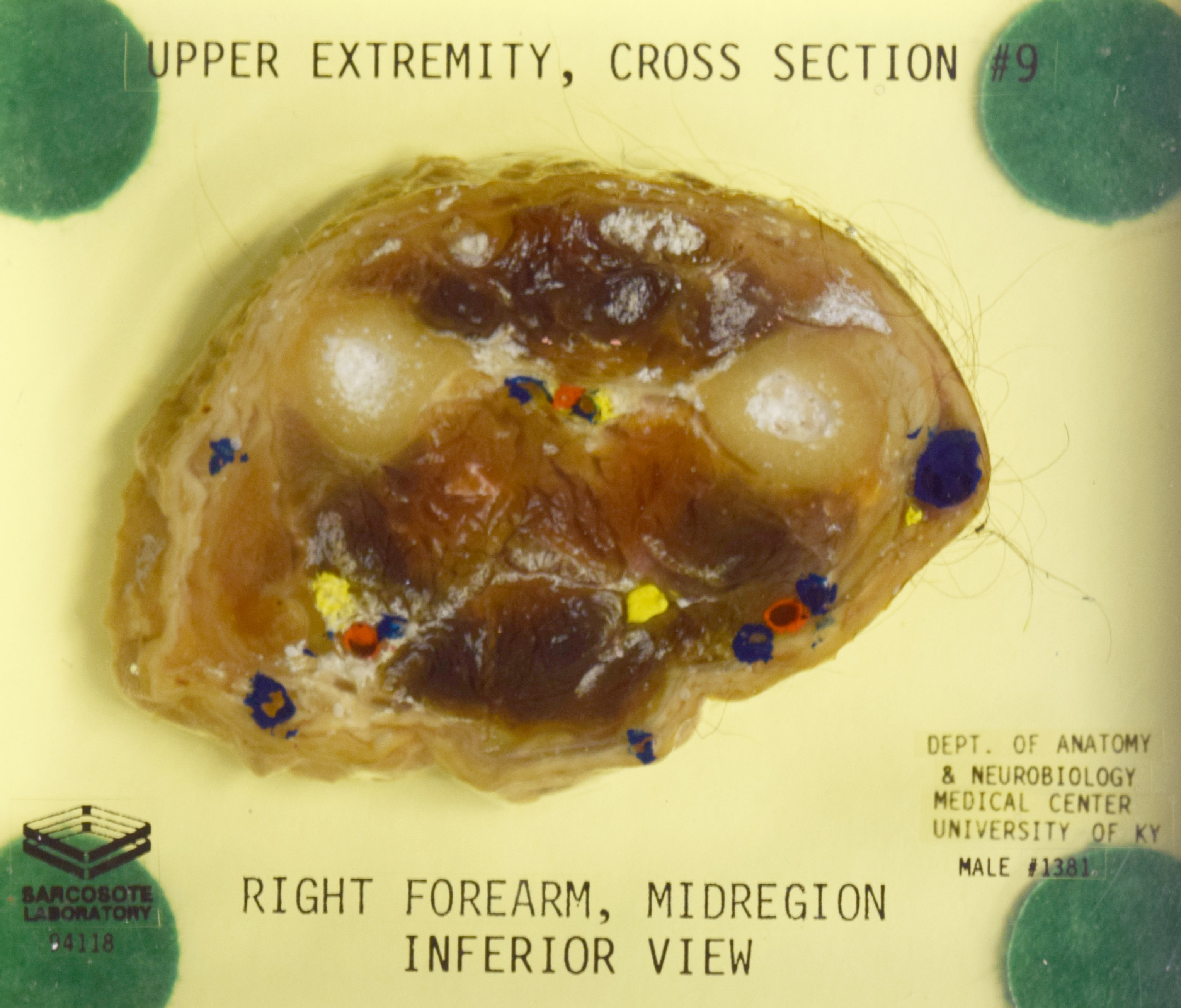 Right upper limb distal to elbow, horizontal section 9. Adult male. Painted to indicate veins (blue), arteries (red), and nerves (yellow). View from inferior. Specimen in acrylic. Property of the University of Kentucky Gross Anatomy Lab. |
