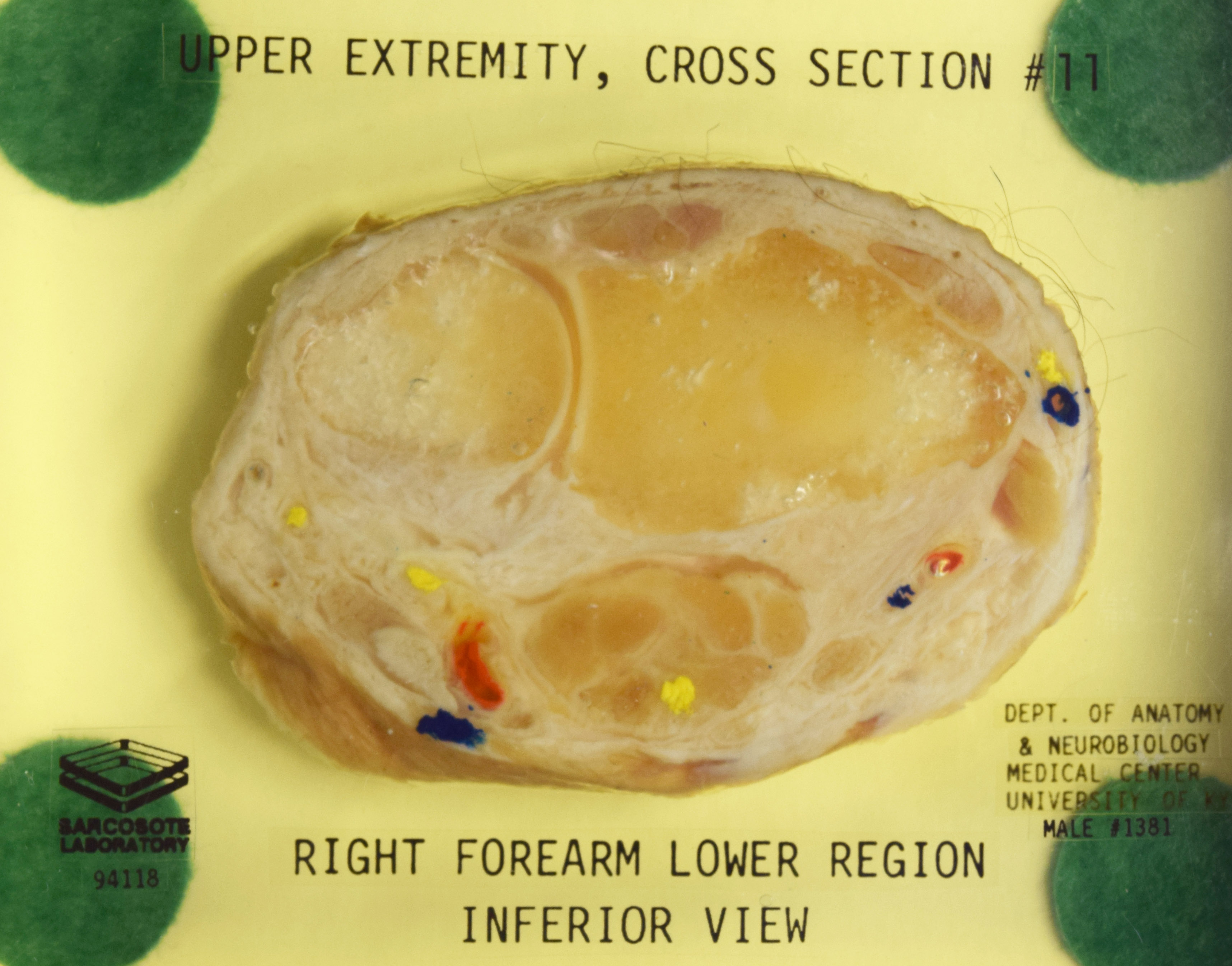 Right upper limb distal to elbow, horizontal section 11. Adult male. Painted to indicate veins (blue), arteries (red), and nerves (yellow). View from inferior. Specimen in acrylic. Property of the University of Kentucky Gross Anatomy Lab. |