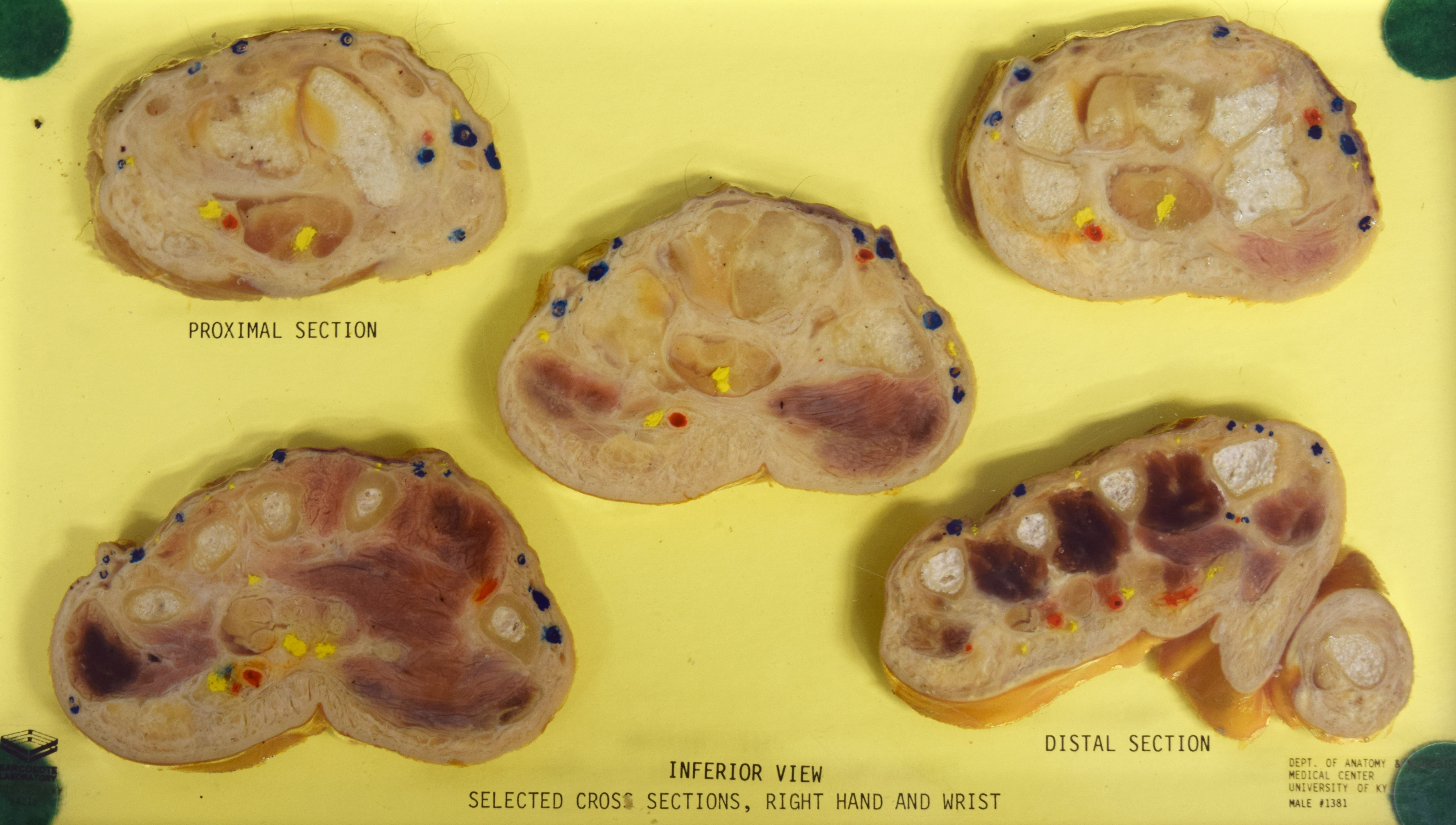 Long Description: Right hand and wrist, horizontal sections. Adult male. Painted to indicate veins (blue), arteries (red), and nerves (yellow). View from inferior. Specimen in acrylic. Property of the University of Kentucky Gross Anatomy Lab.