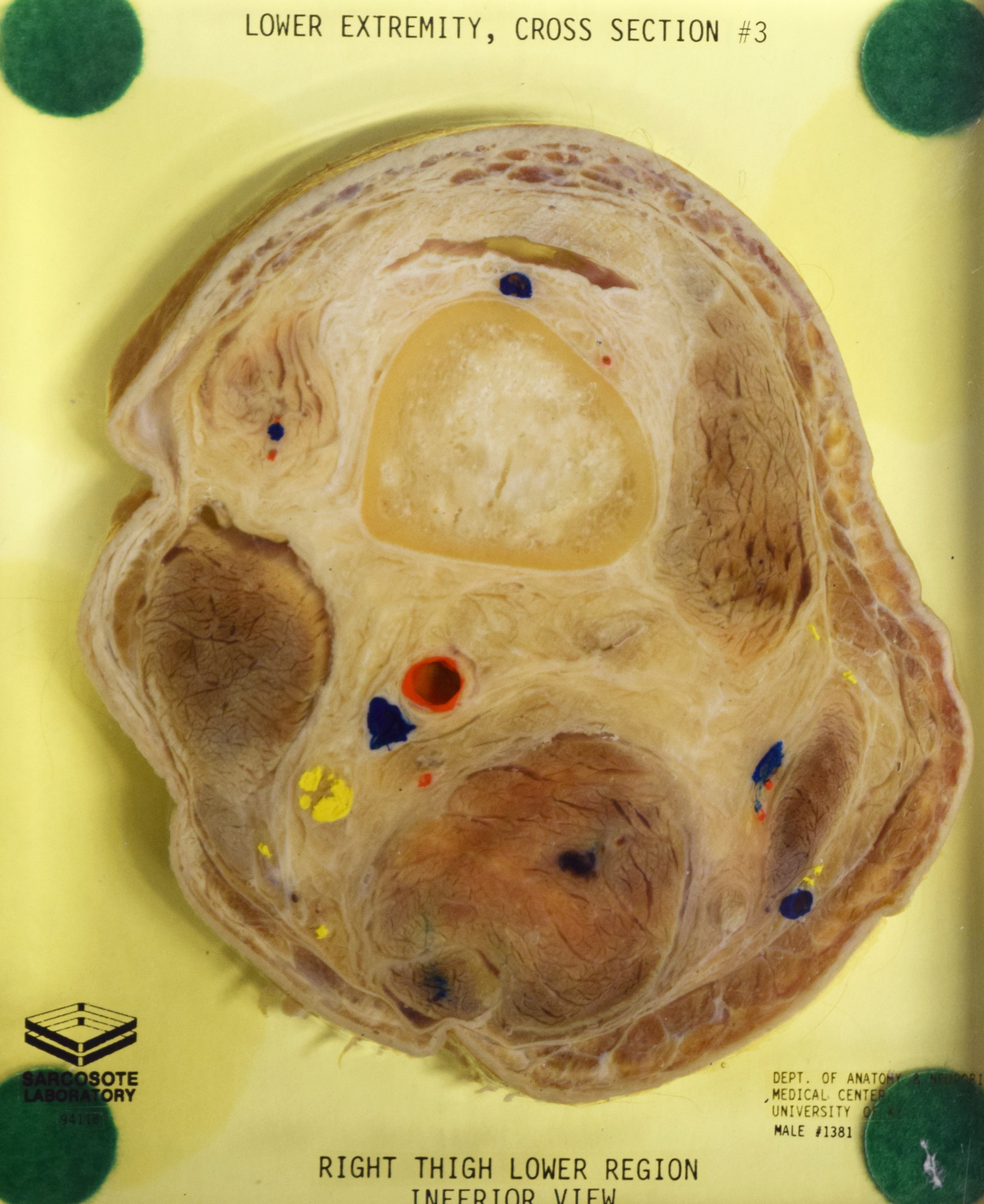 Right lower limb proximal to knee, horizontal section 3. Adult male. Painted to indicate veins (blue), arteries (red), and nerves (yellow). View from inferior. Specimen in acrylic. Property of the University of Kentucky Gross Anatomy Lab. |