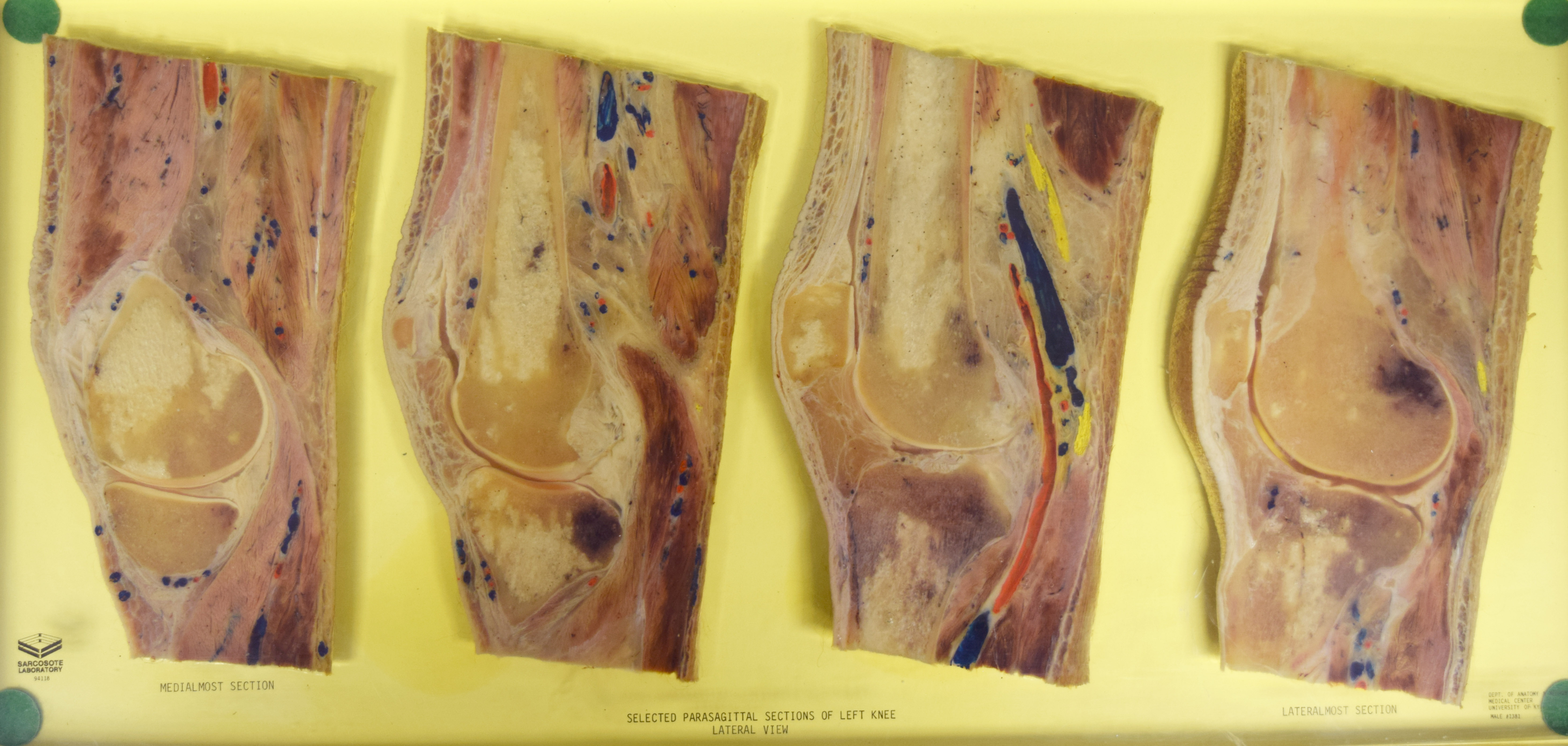 Long Description: Left knee, parasagittal sections. Adult male. Painted to indicate veins (blue), arteries (red), and nerves (yellow). Specimen in acrylic. Property of the University of Kentucky Gross Anatomy Lab.