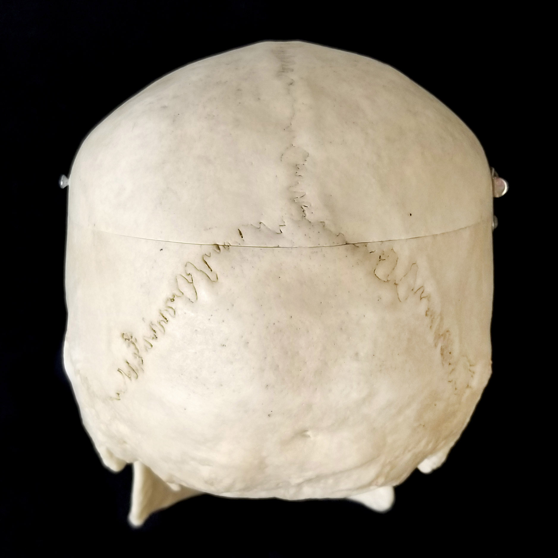 Adult human skull with ossicles in lambdoid and sagittal sutures. Posterior view. |