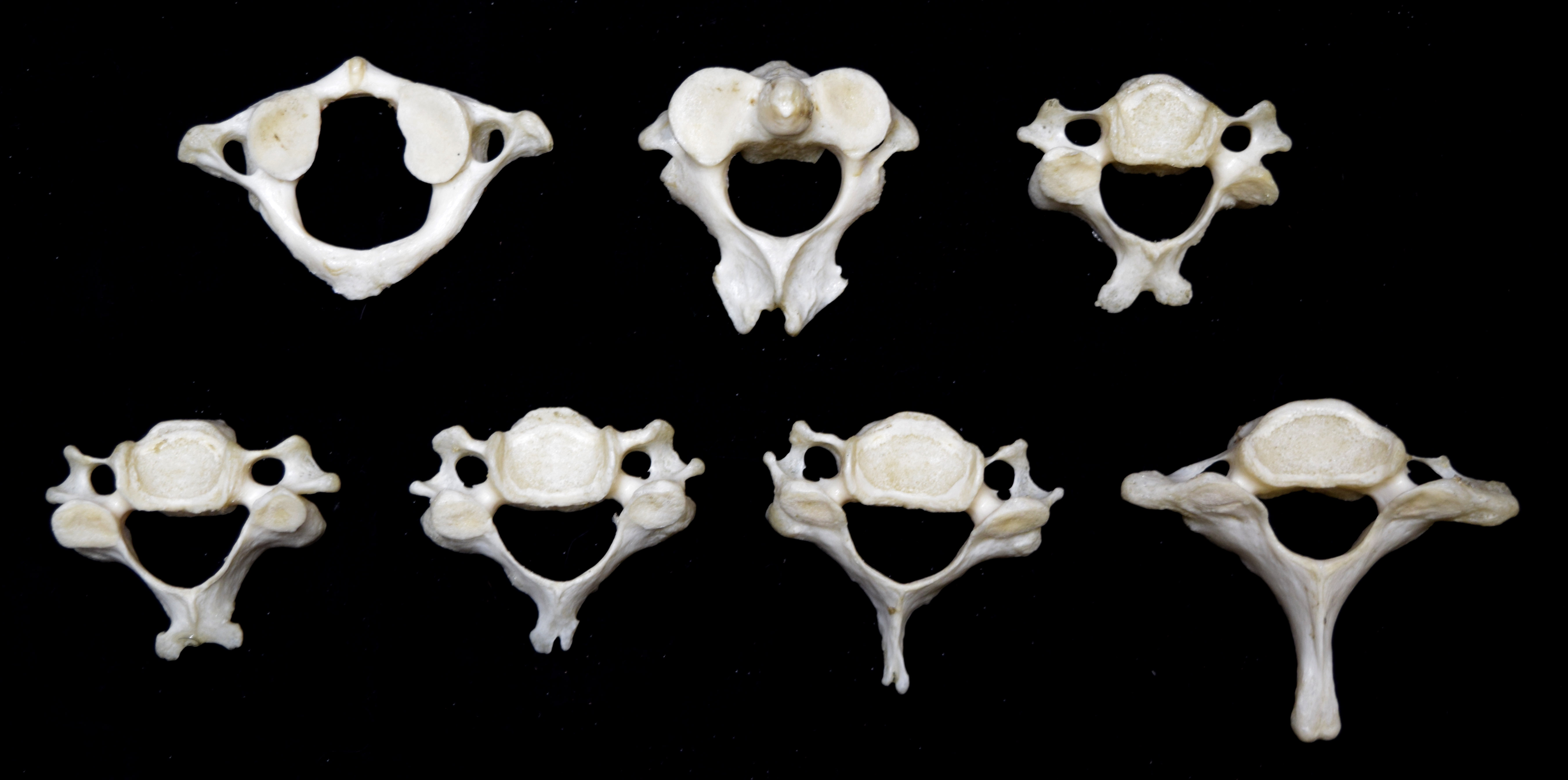 Cervical vertebrae, superior view. C1 through C7, arranged left to right, top to bottom. |