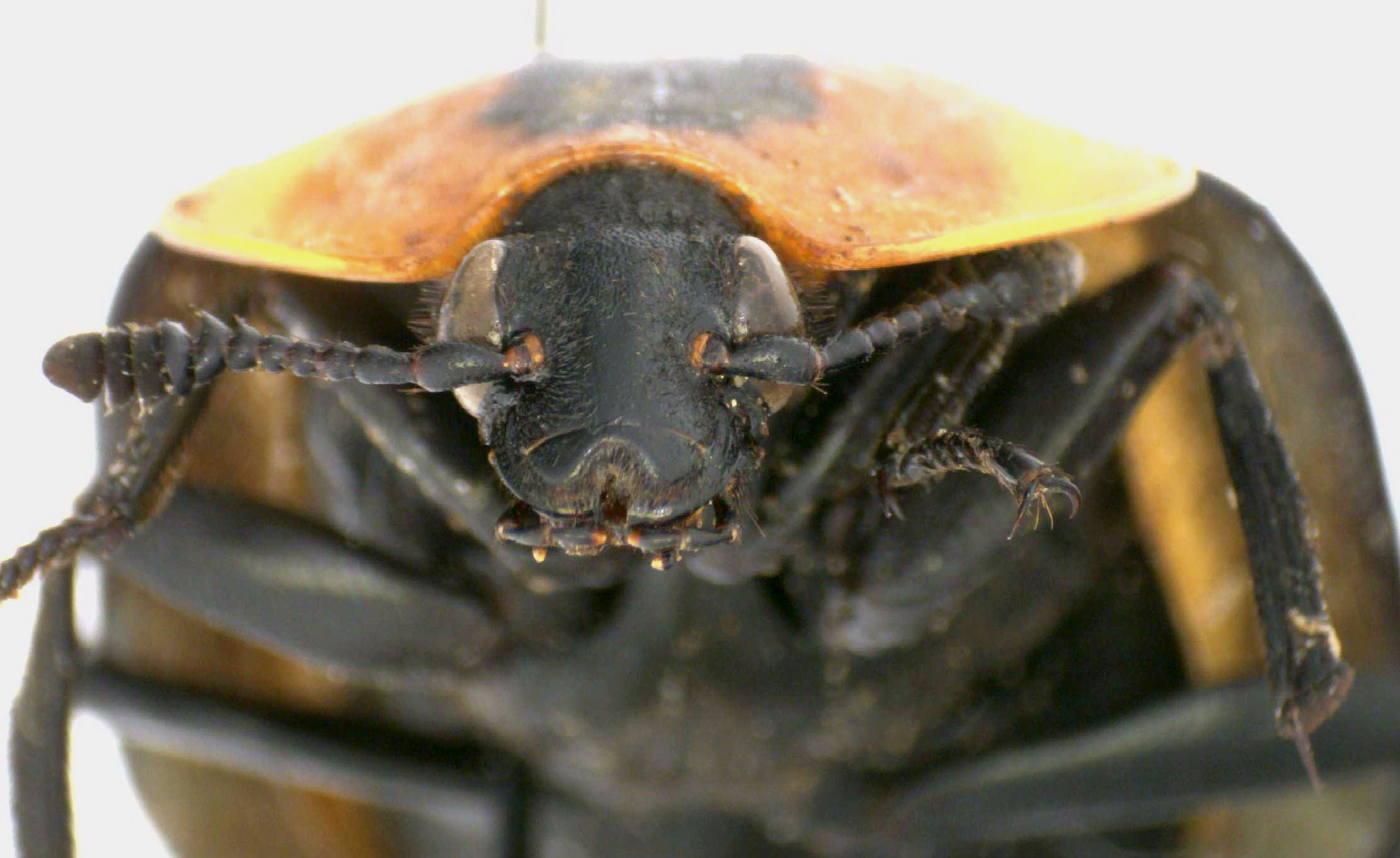 Adult female N. americana. Anterior view of head. Specimen dimensions: width of elytra = 14 mm; width of pronotum = 11.5 mm. |