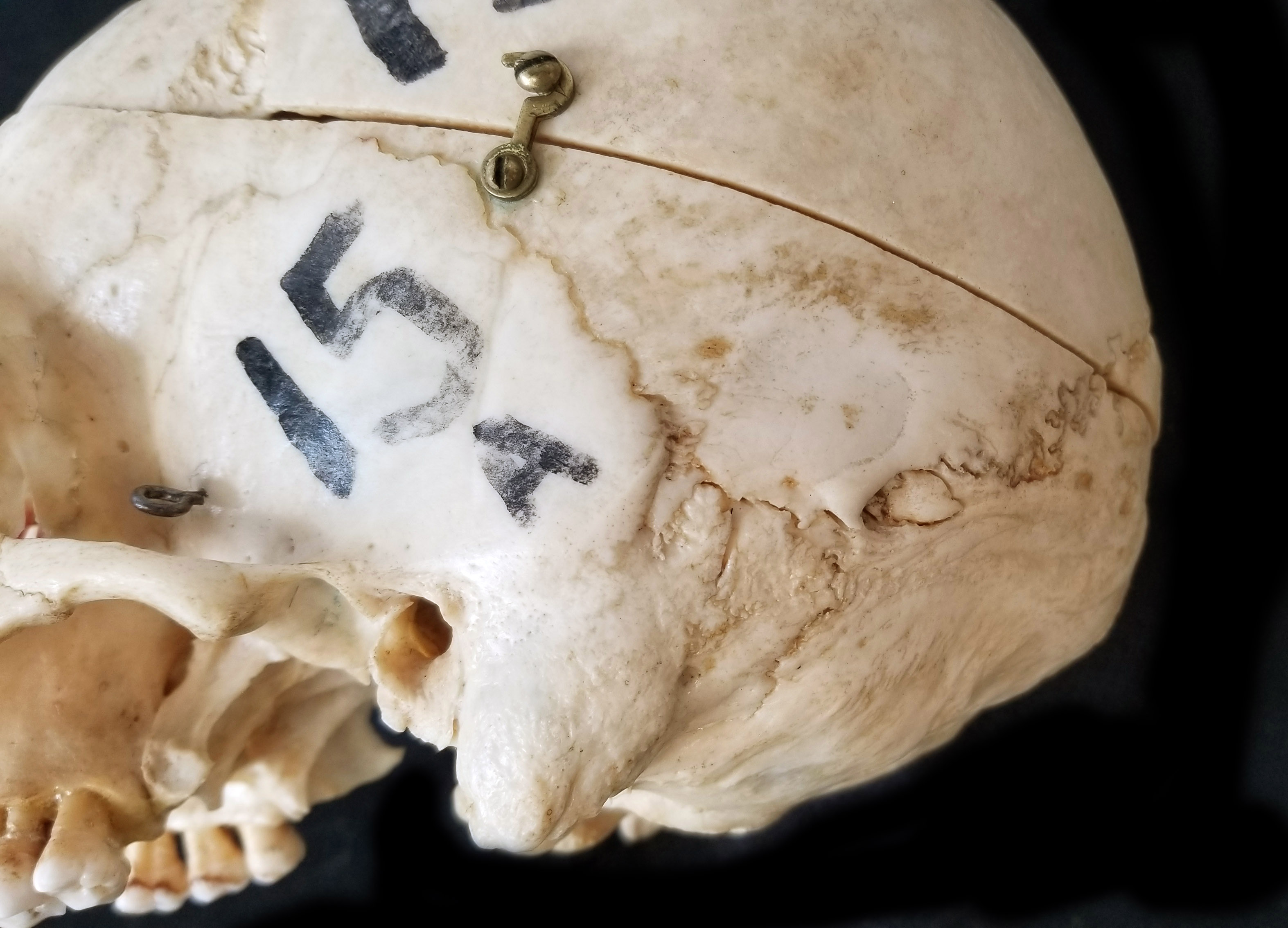 Adult human skull with parietal notch ossicle. Additional ossicle at end of lambdoid suture. Left posterolateral view. |