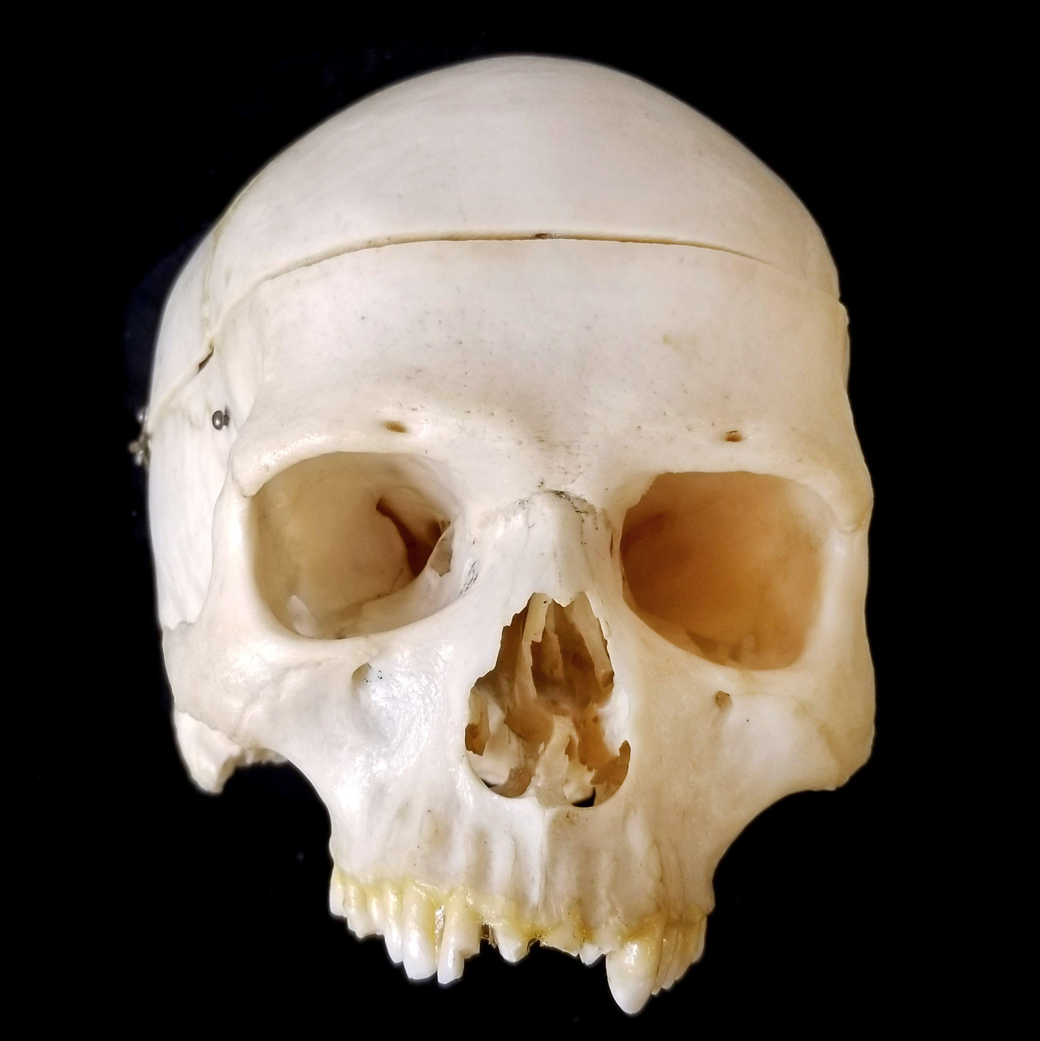 Adult human skull with faint supranasal suture. Right infraorbital suture is faintly visible. Anterior view. |