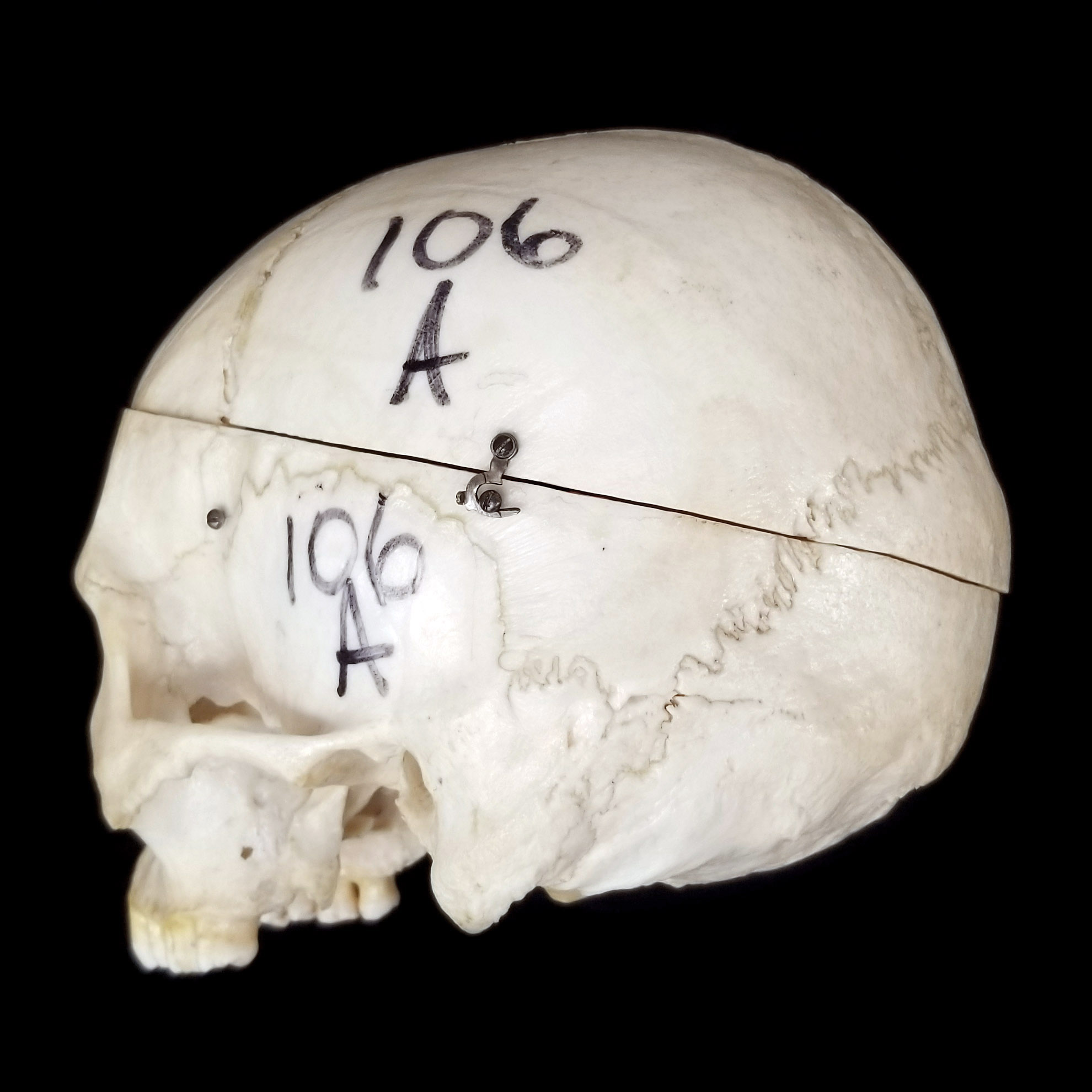 Adult human skull with mendosal suture. Left posterolateral view. |